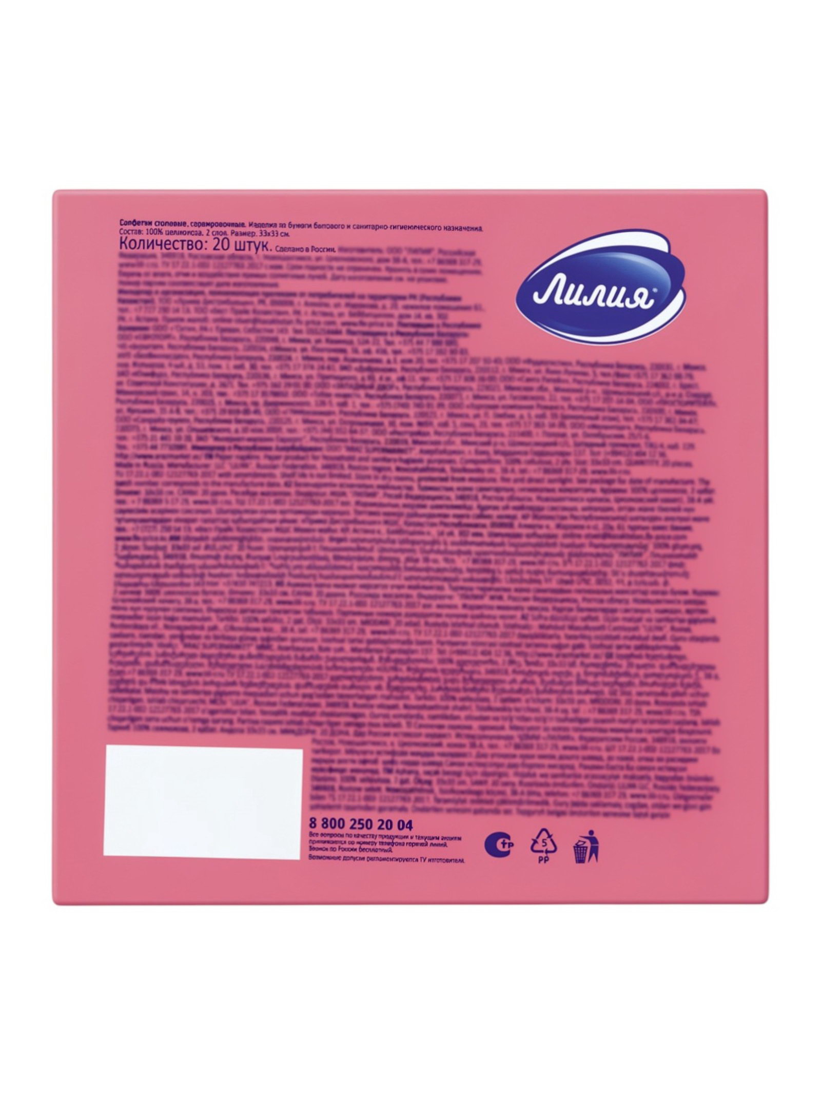 Салфетки бумажные, 33x33 "Розовый" 2сл 20 л, Лилия, Россия