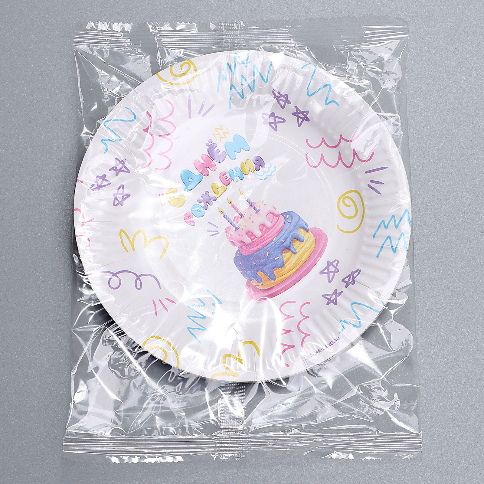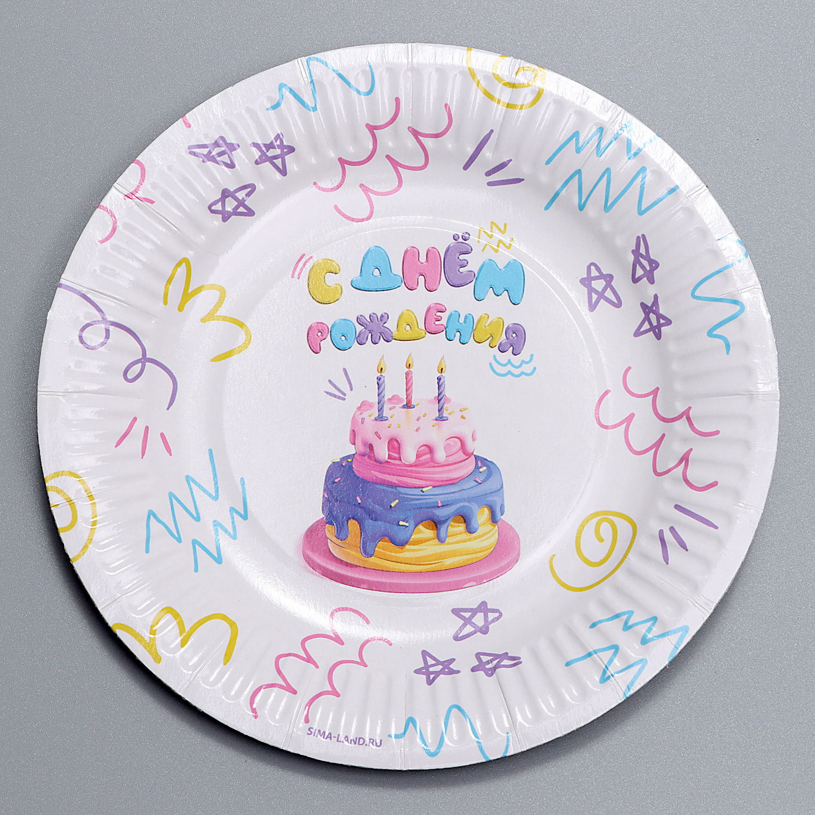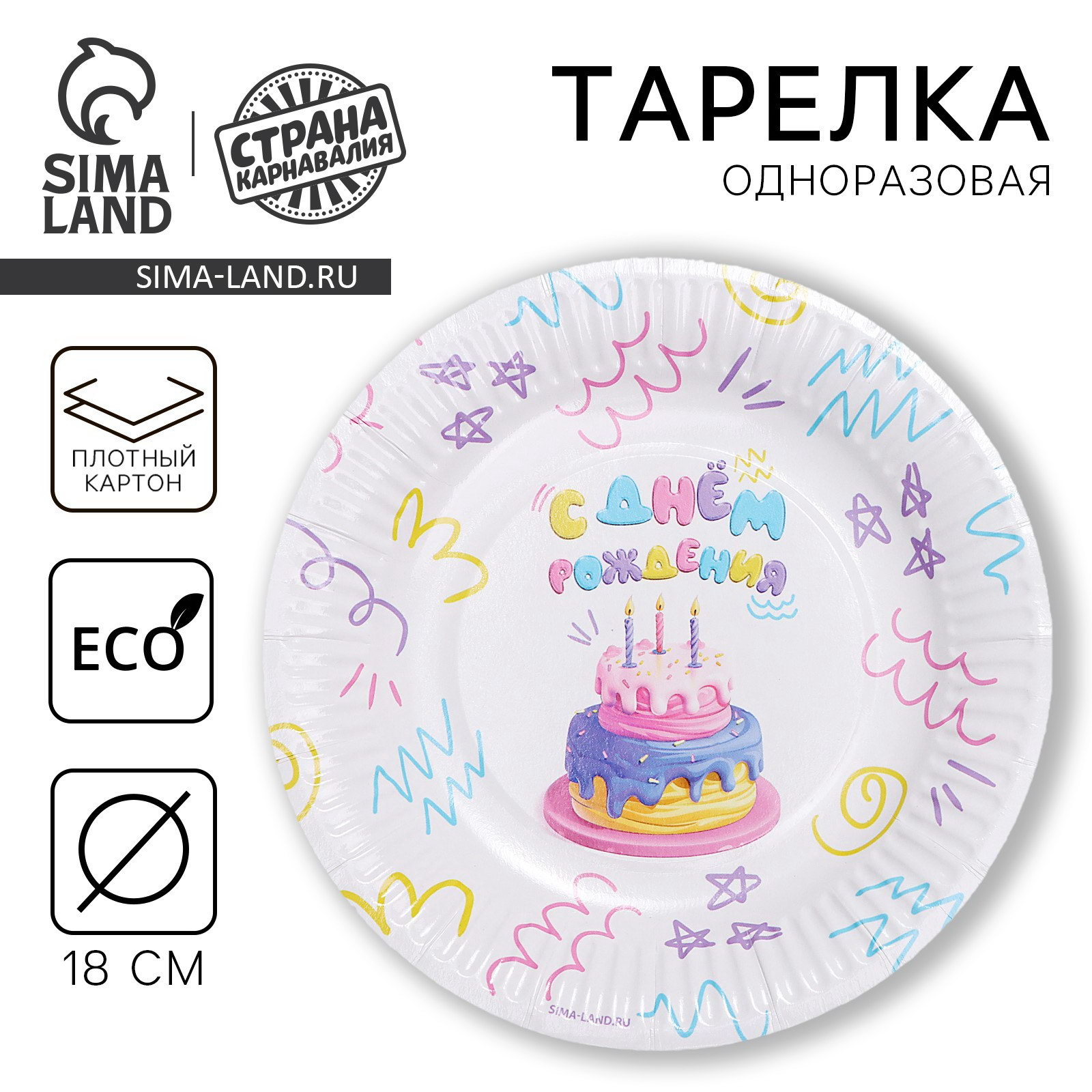 Тарелка одноразовая бумажная "С днём рождения" тортик, 18 см, 18 см., Страна Карнавалия, Россия