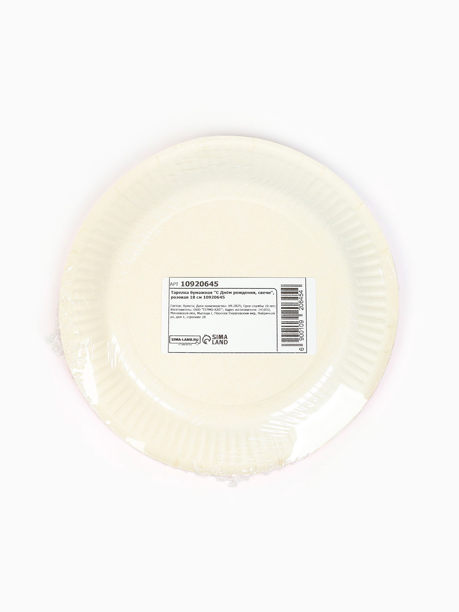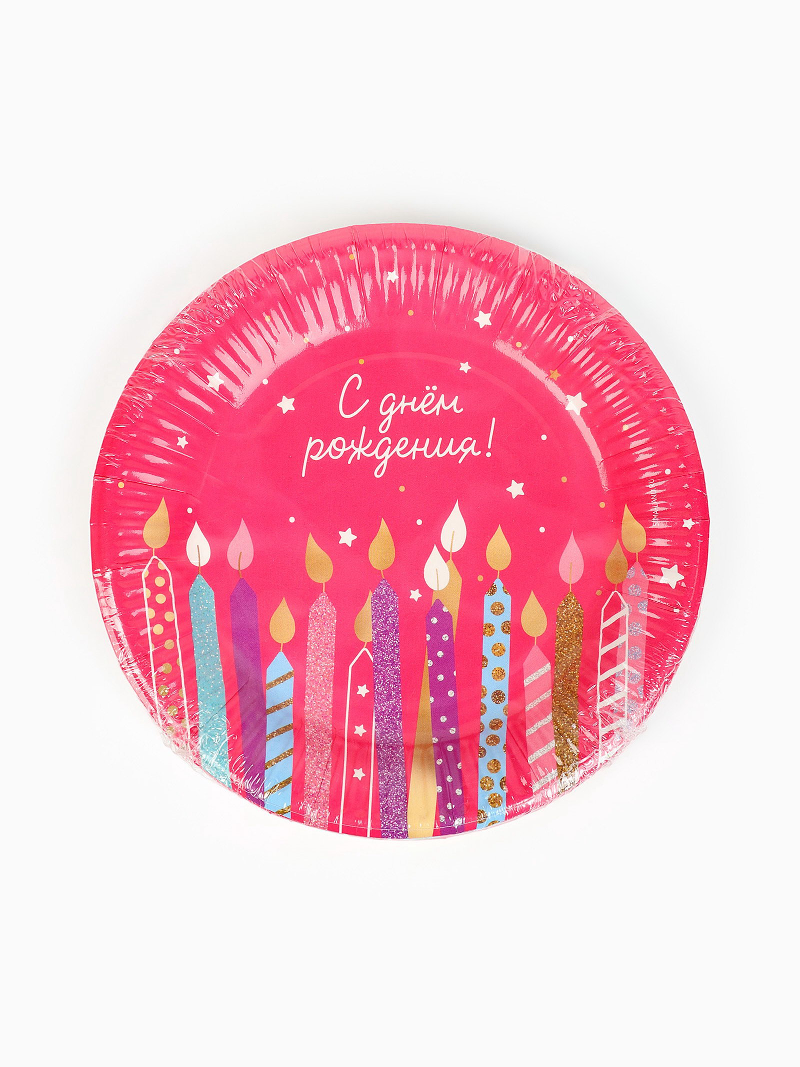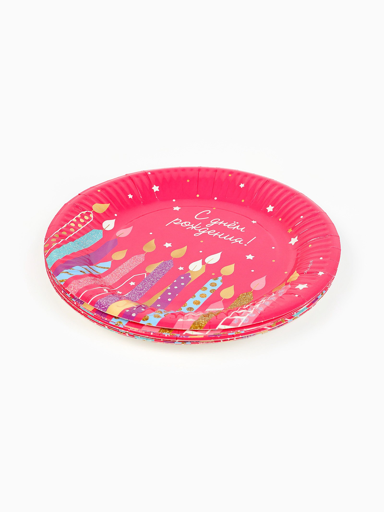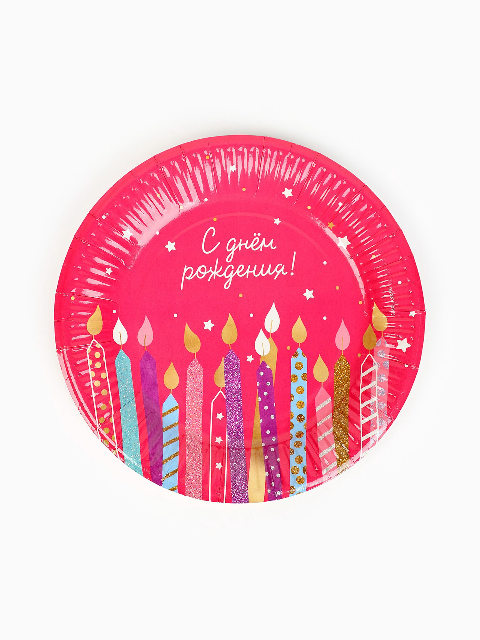 Тарелка одноразовая бумажная "С Днём рождения, свечи", розовая, 18 см, 18 см., Россия