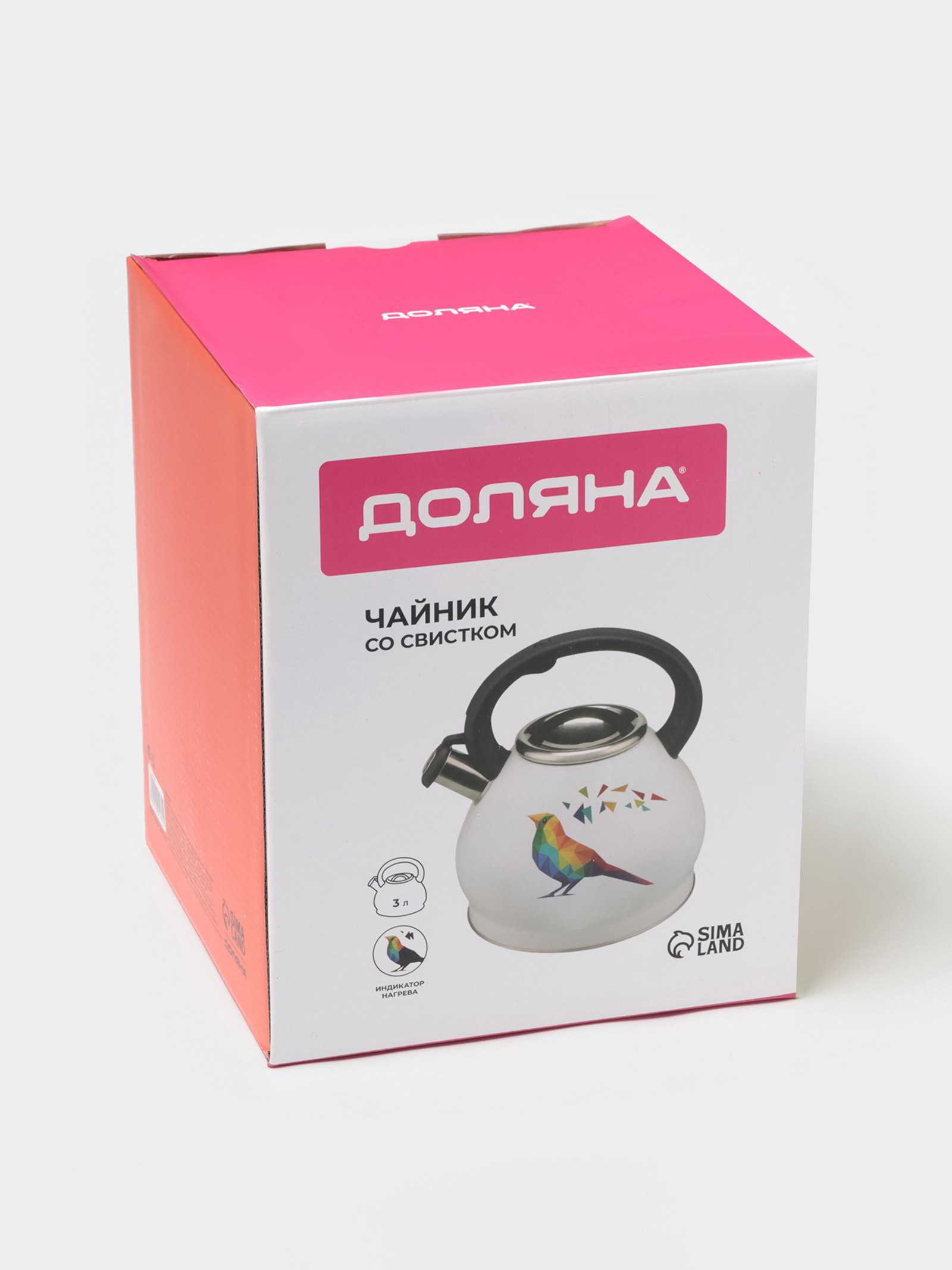 Чайник Magic birds, 3 л, со свистком, с индикатором нагрева, индукция, нержавеющая сталь, белый, 19.5x22x21 см., Доляна, Китай