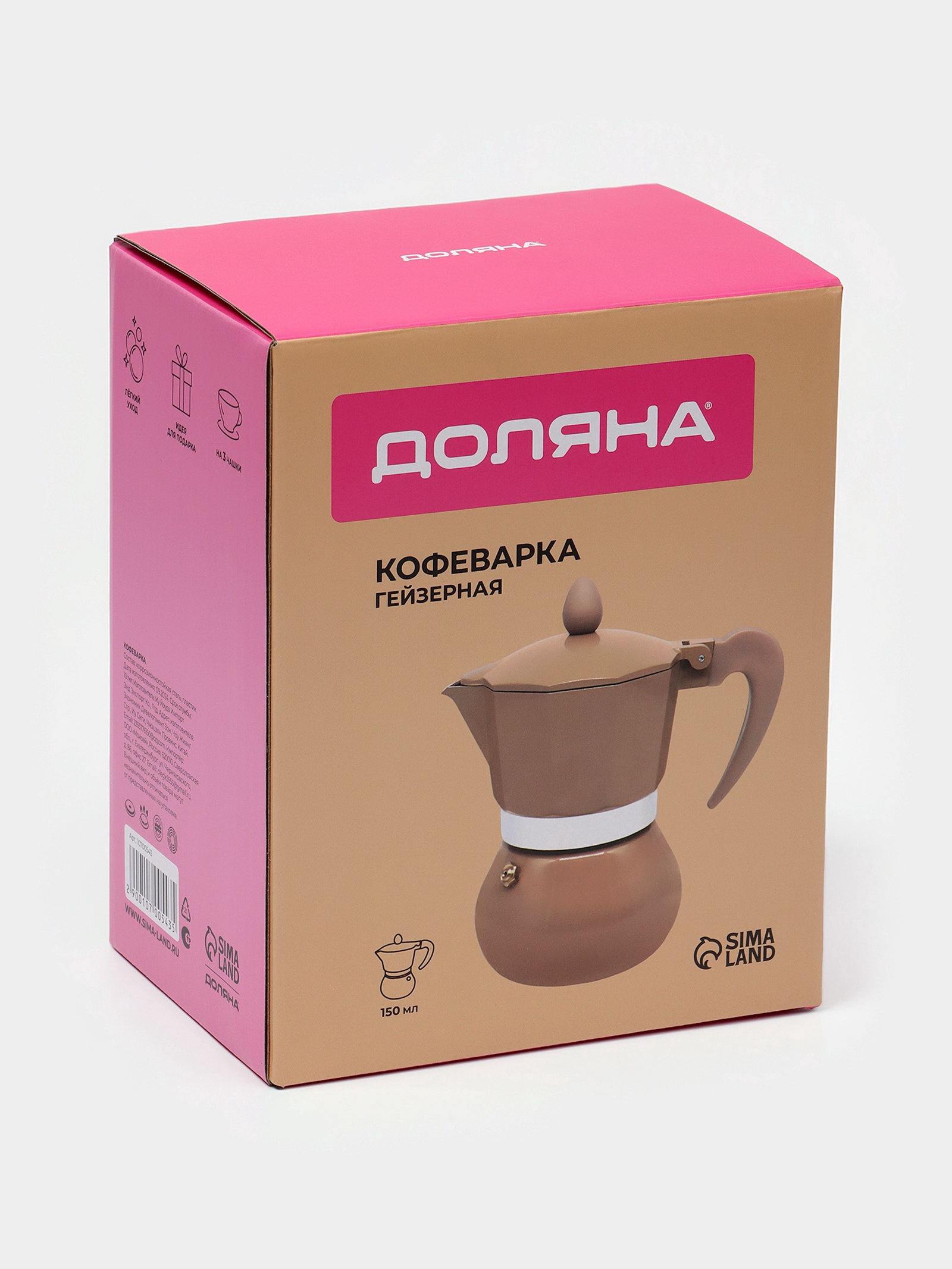 Кофеварка гейзерная "Мокко", 150 мл, на 3 чашки, нержавеющая сталь, коричневая, 12.5x16.5x10 см., Доляна, Китай