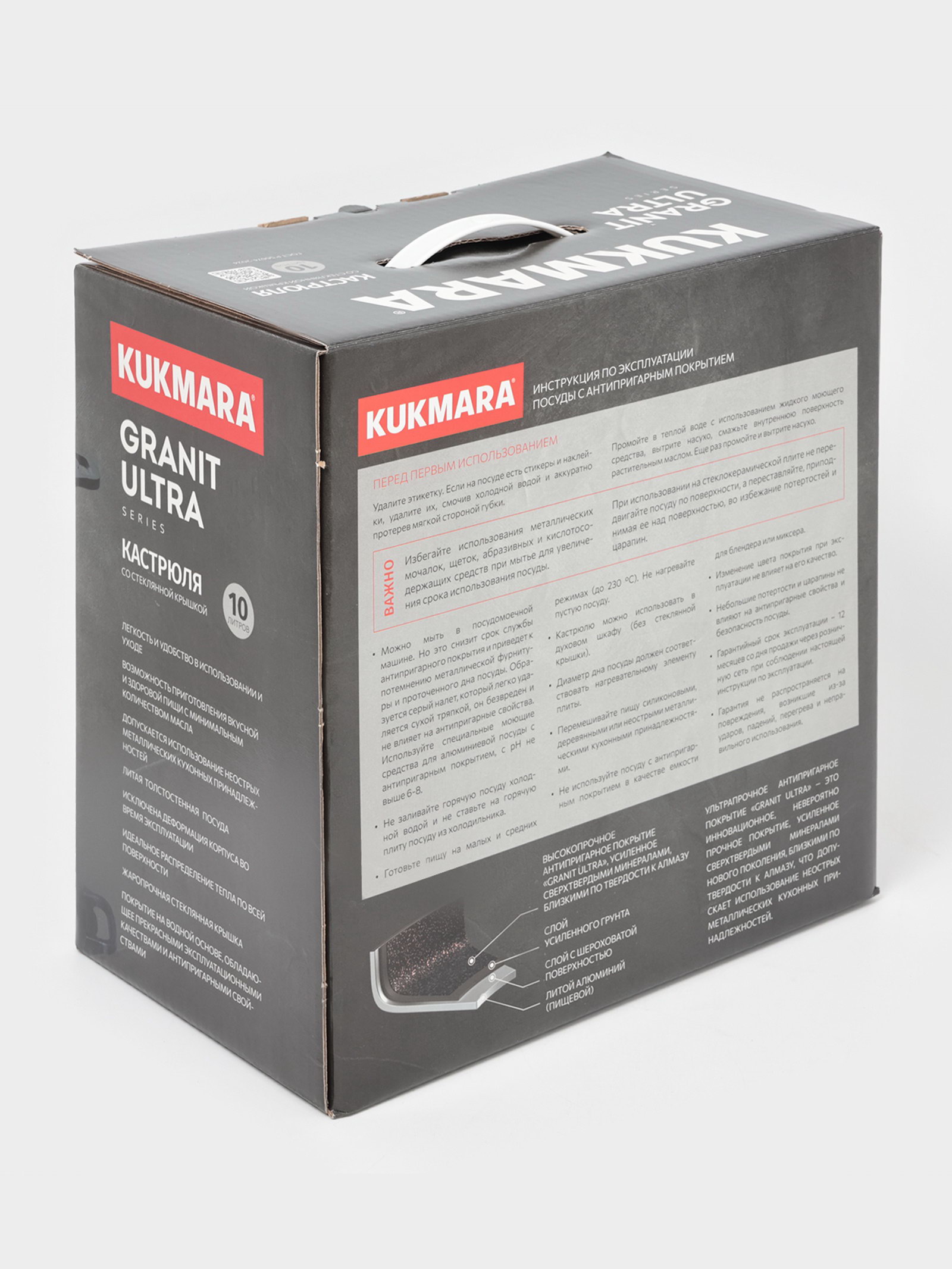 Тип плиты: Для газовой плиты, Для стеклокерамической плиты, Для электрической плиты Тип покрытия: Антипригарное, Антипригарное с эффектом гранита Размер упаковки: 34 x 34 x 20 см. Форма: Круг Набор: Нет Антипригарное покрытие: Да tnved: 7615101000 Цвет: Серый Температурное ограничение: Нет Крышка: Да Рисунок: Нет Капсульное дно: Нет Материал крышки: Стекло Толщина стенки, мм: 4.5 Толщина дна, мм: 6 Диаметр дна, см: 23 Высота стенки, см: 19 Можно мыть в посудомоечной машине: Да Кастрюля Kukmara сделана из литого алюминия и имеет уникальное ультрапрочное антипригарное покрытие Ultra granit. Ultra granit это инновационное, невероятно прочное покрытие, усиленное сверхтвёрдыми минералами нового поколения, близкими по твёрдости алмазу. Его прочность позволяет использовать даже металлические кухонные принадлежности без риска повредить поверхность. Покрытие Ultra granit продлевает срок службы посуды более чем в 7 раз! Особенности