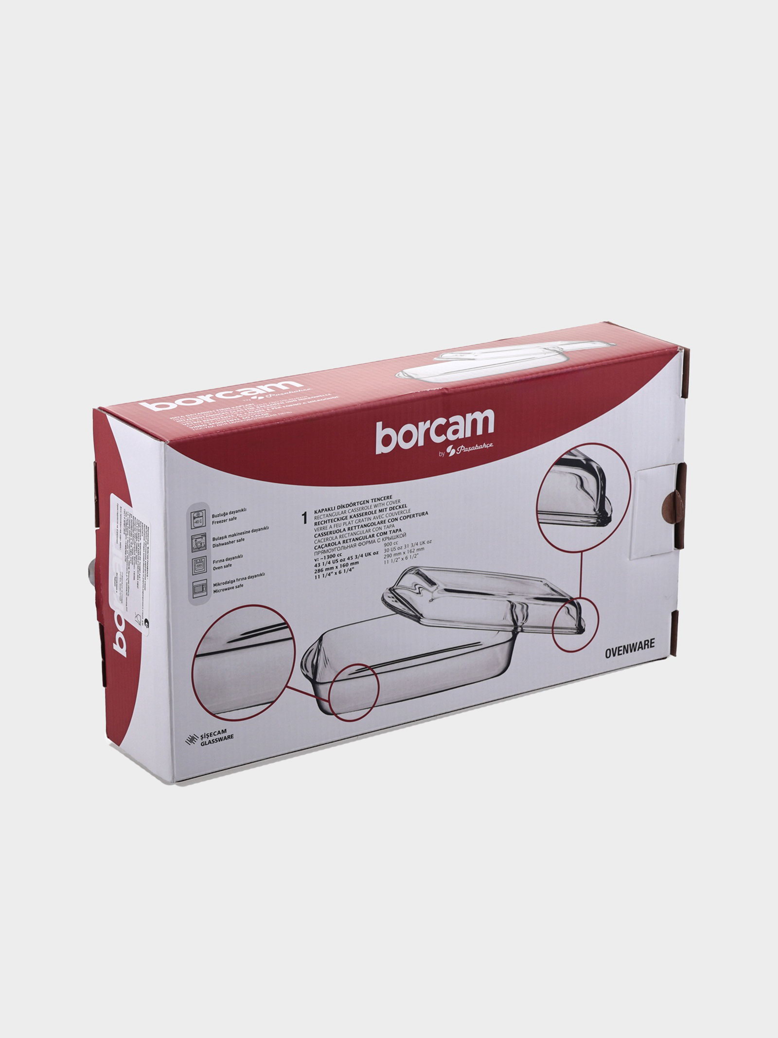 Форма для запекания Borcam, 1.3/0.9 л, 28.6x16x5 см, с крышкой, прямоугольная, жаропрочное стекло, прозрачная, Pasabahce, Турция