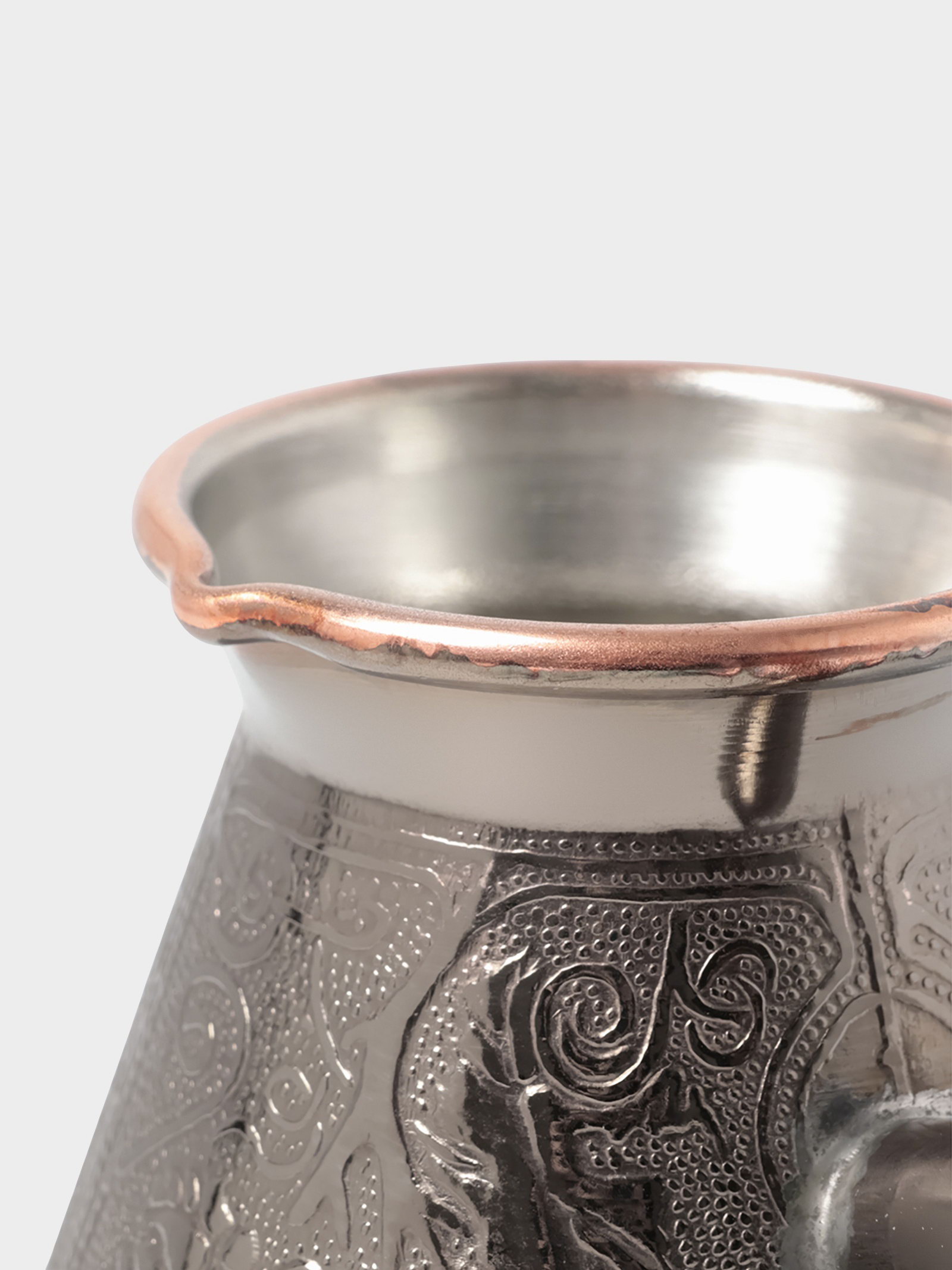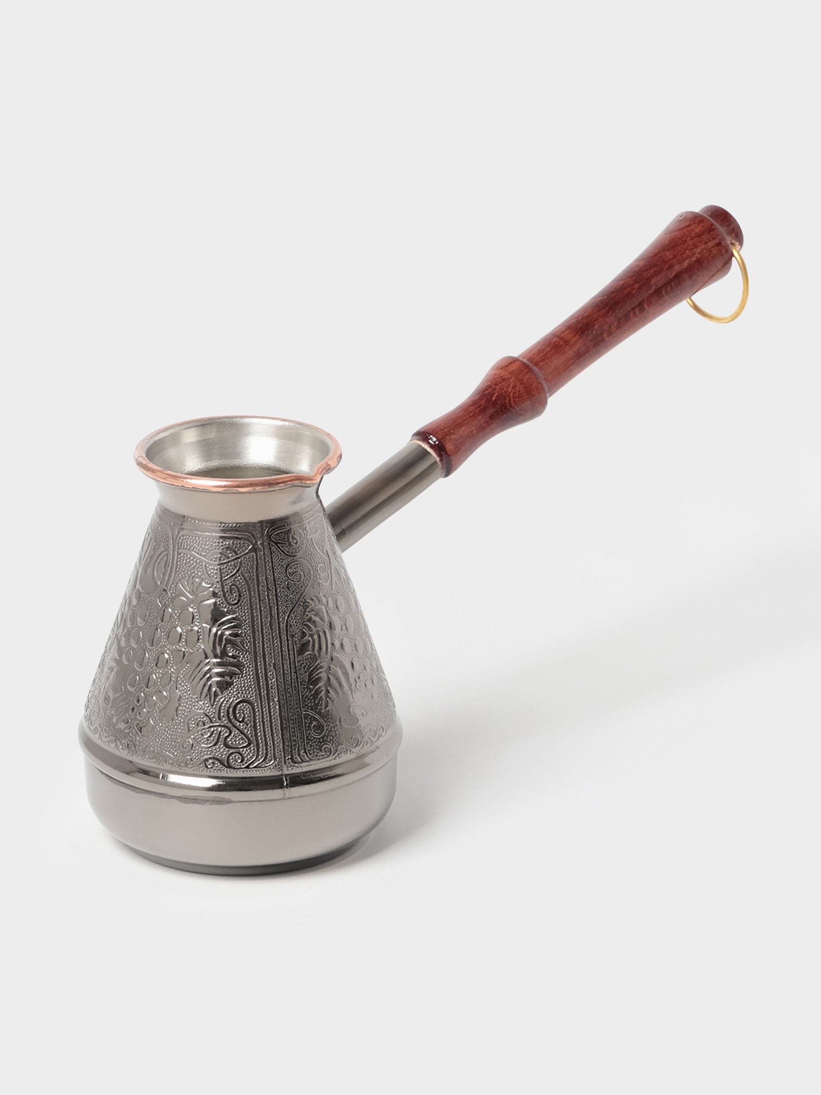 Тип плиты: Для газовой плиты, Для стеклокерамической плиты, Для электрической плиты Размер упаковки: 7 x 10 x 22 см. Рисунок: Да Набор: Нет Крышка: Нет Цвет: Серебристый tnved: 7418101000 tnved: 7418101000 Товар Каспи: Турки для кофе В наборе, шт.: 1 Материал ручки: Дерево Можно мыть в посудомоечной машине: Нет Запрет реализации по сегментам: 00000000485 Погрузитесь в мир ароматного кофе! Турка с узором виноградной лозы это идеальный аксессуар для настоящих ценителей кофе. Объем в 300 мл позволяет приготовить несколько порций, а медный материал обеспечивает равномерный нагрев, раскрывая все нюансы вкуса вашего напитка. Преимущества: