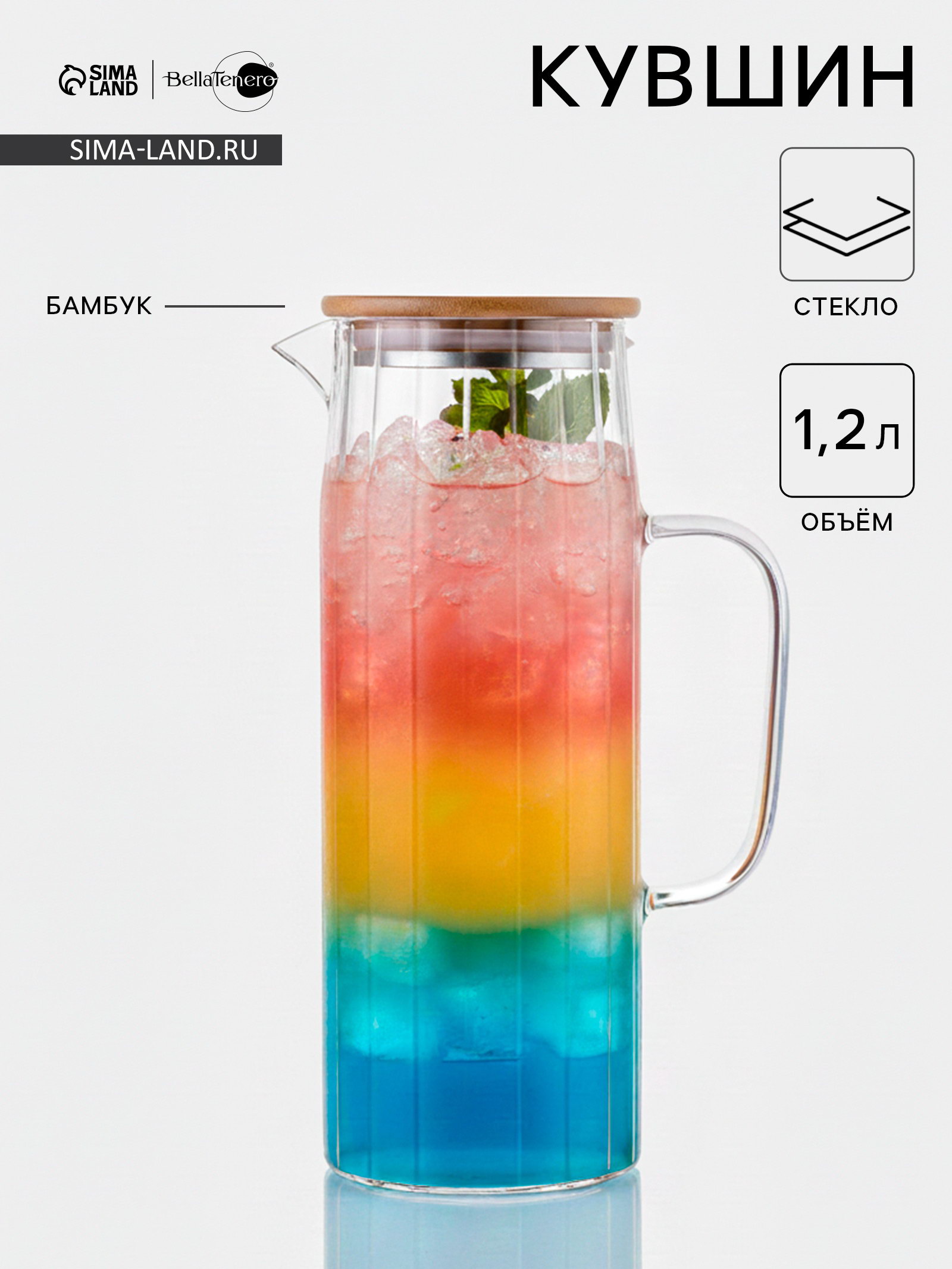 Кувшин Bella Tenero "Эко. Дольки", 1.2 л, 9x14x24.5 см, с бамбуковой крышкой, стекло, прозрачный, 14x9x24.5 см., BellaTenero, Китай