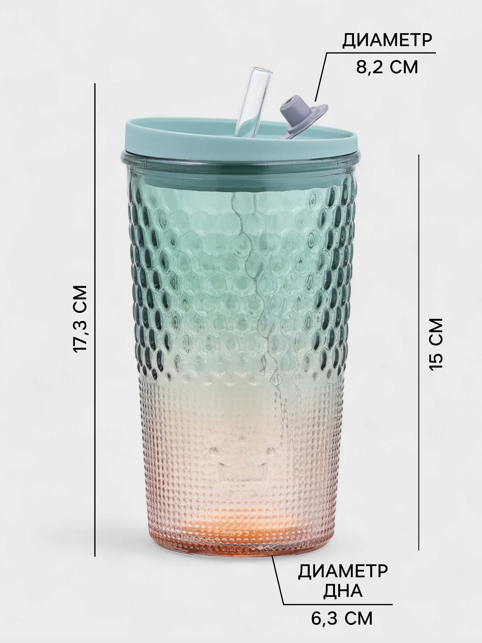 Стакан "Спектр", 500 мл, 8x16 см, с трубочкой, силиконовая крышка, стекло, зелёный, 8x8x16 см., Китай