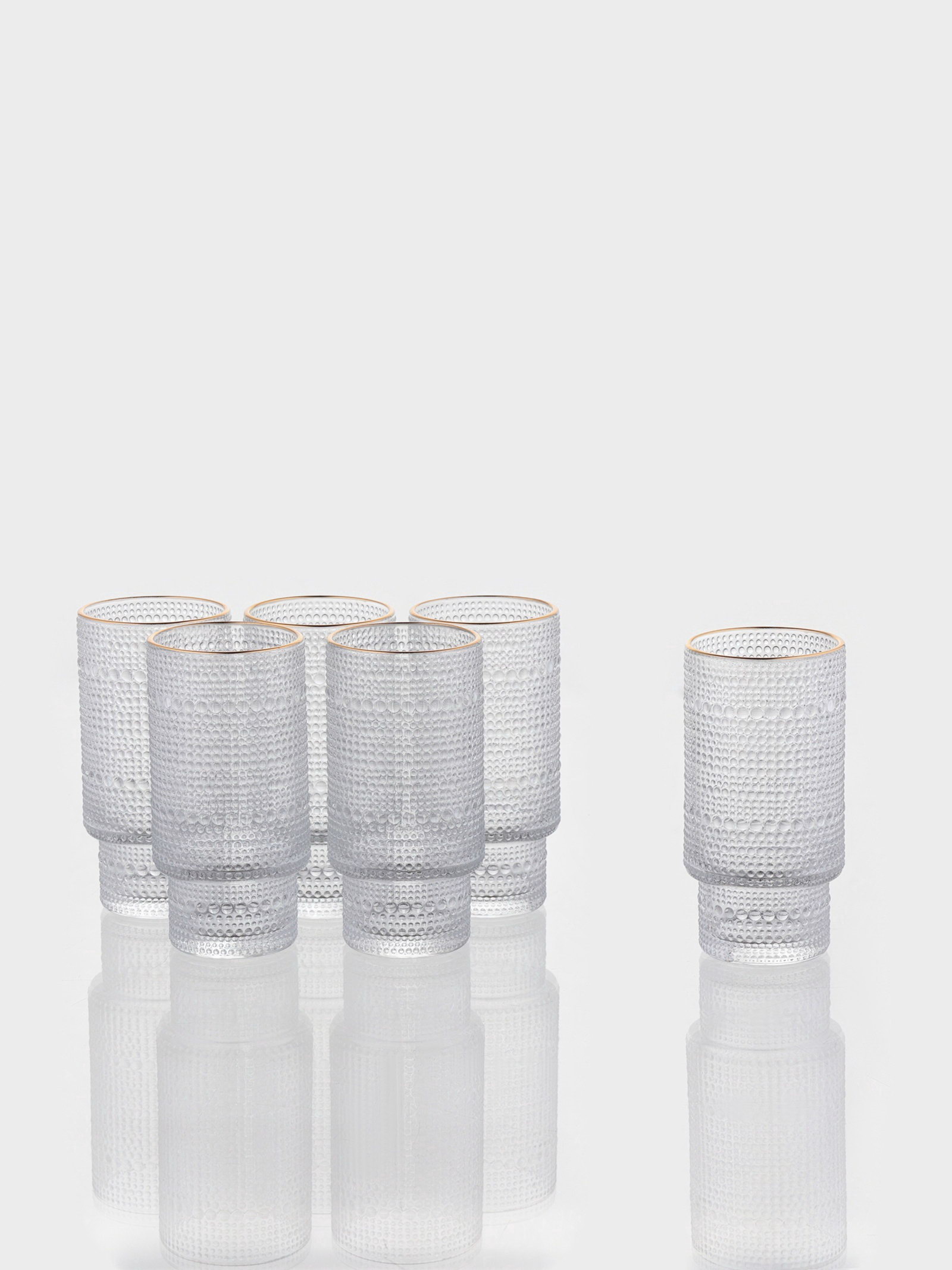 Размер упаковки: 14.5 x 14.5 x 21.5 см. tnved: 7013379000 Особенности: С золотой отводкой В наборе, шт.: 6 Цвет: Прозрачный Текстура: С рельефом Набор: Да Рисунок: Нет Можно мыть в посудомоечной машине: Нет Можно использовать в СВЧ-печи: Нет Элегантная сервировка стола! Набор стаканов – комплект из шести стеклянных ёмкостей для напитков. Он подходит для повседневного использования на кухне или во время трапез. Особенности: