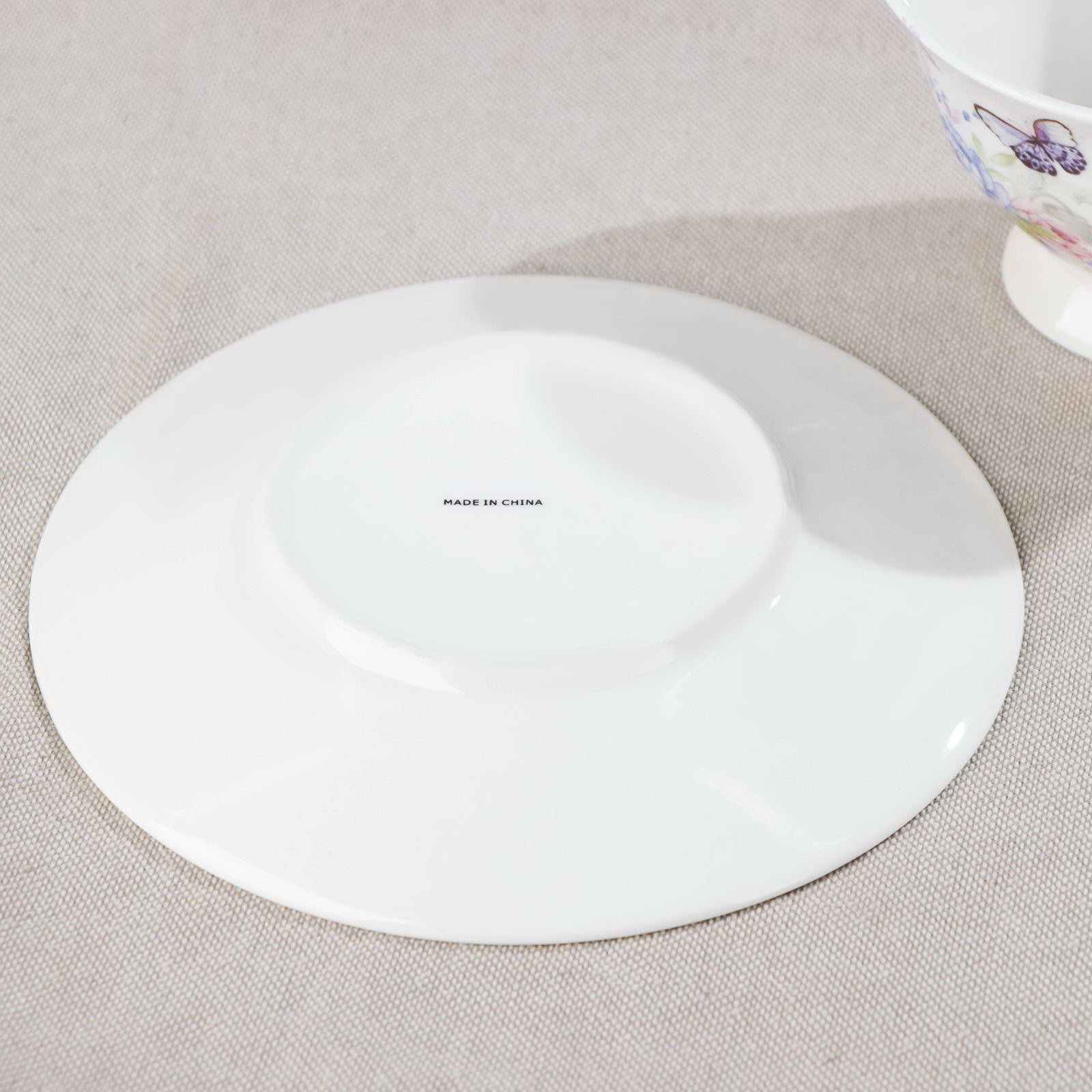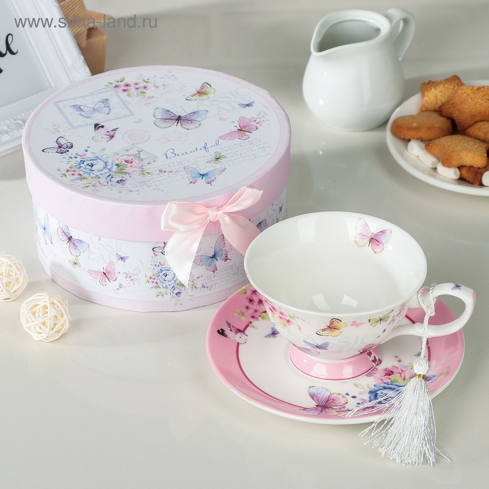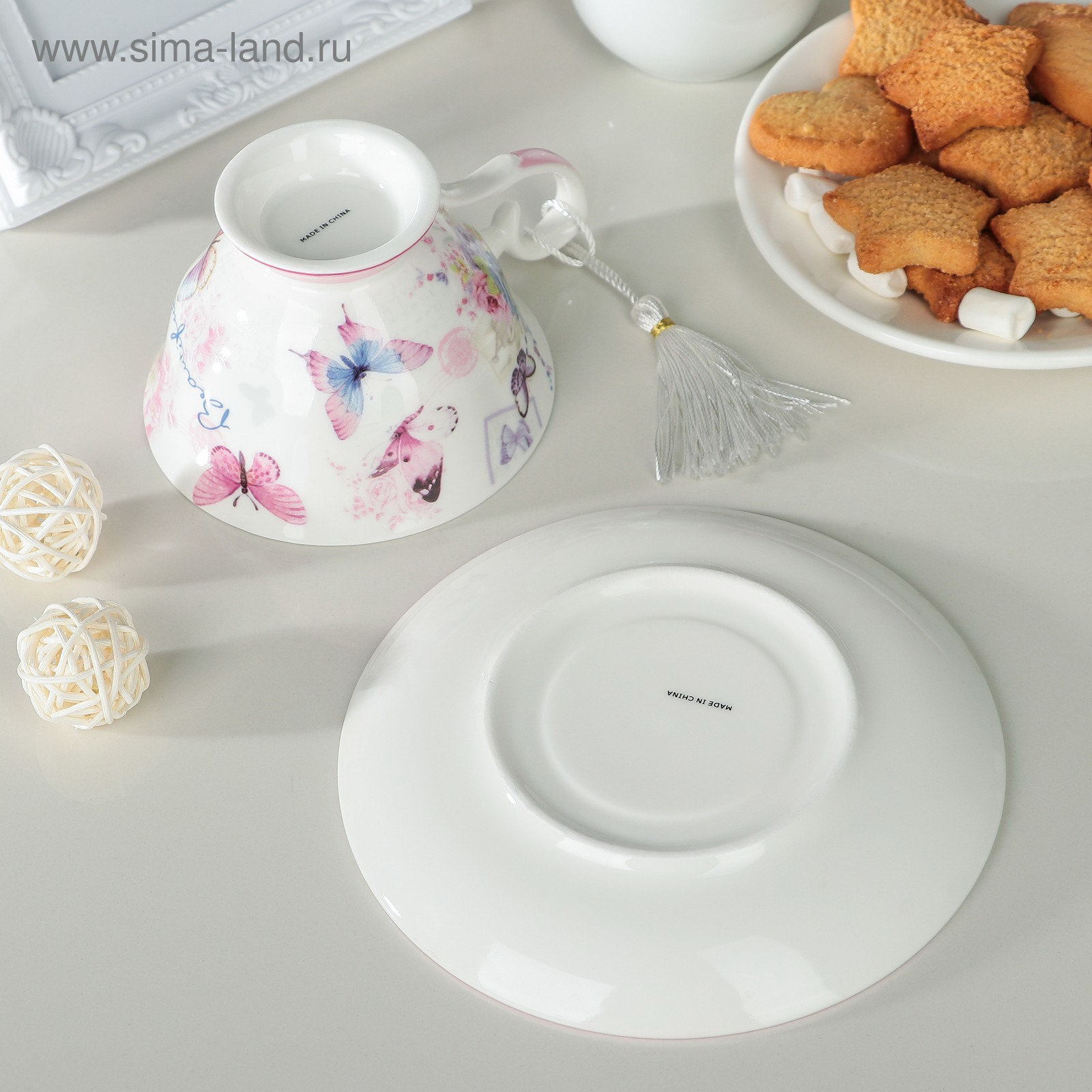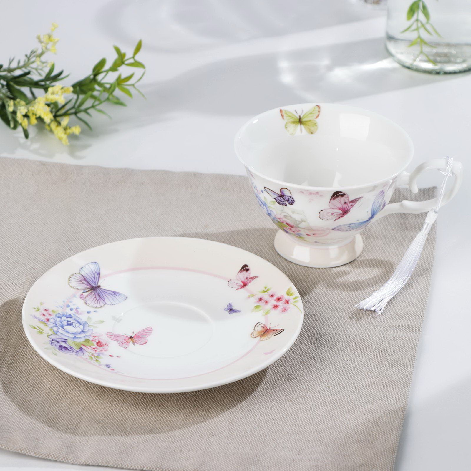 Чайная пара керамическая в подарочной упаковке "Бабочки", 2 предмета: чашка 220 мл, блюдце d=15 см, цвет белый, 16.5x16.5x8 см., Китай