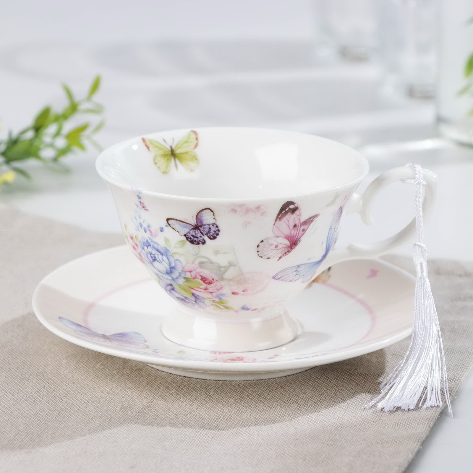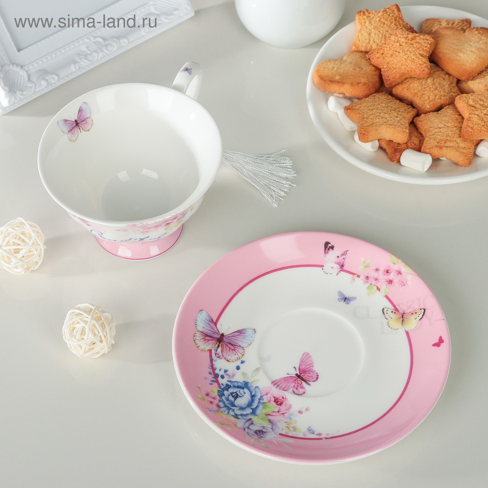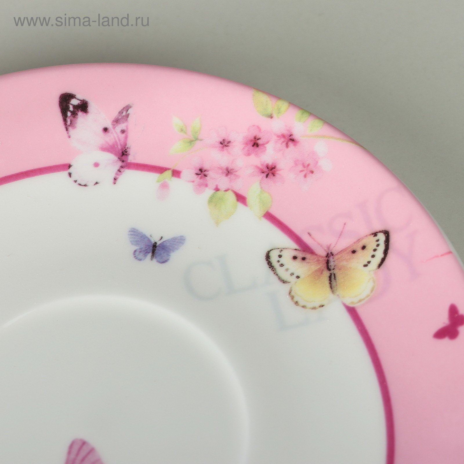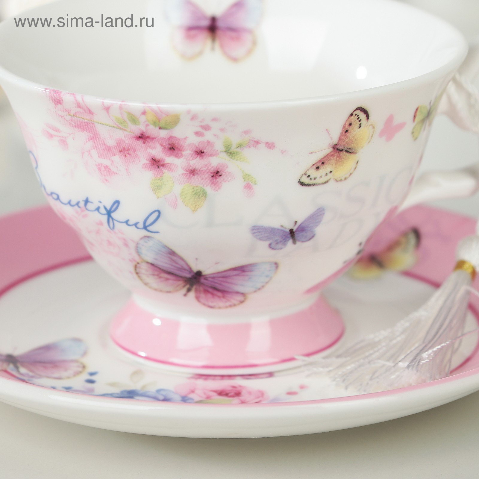 Чайная пара керамическая в подарочной упаковке "Бабочки", 2 предмета: чашка 220 мл, блюдце d=15 см, цвет белый, 16.5x16.5x8 см., Китай