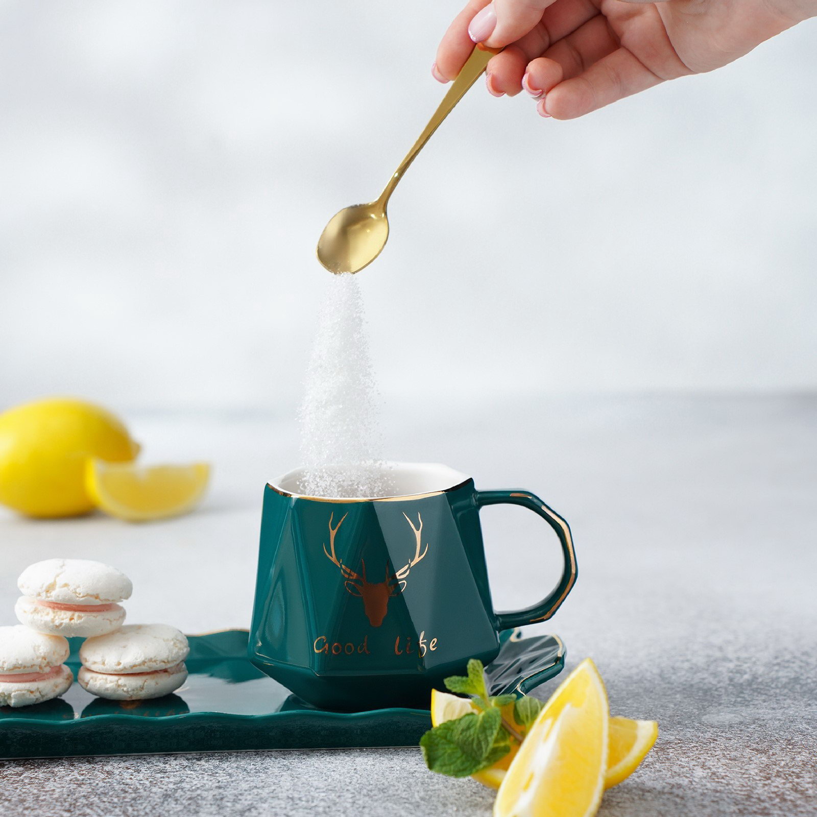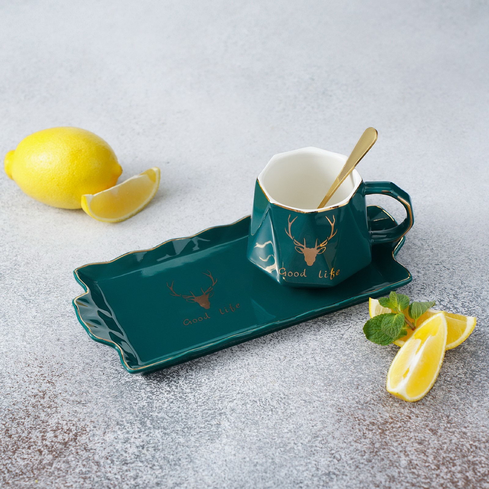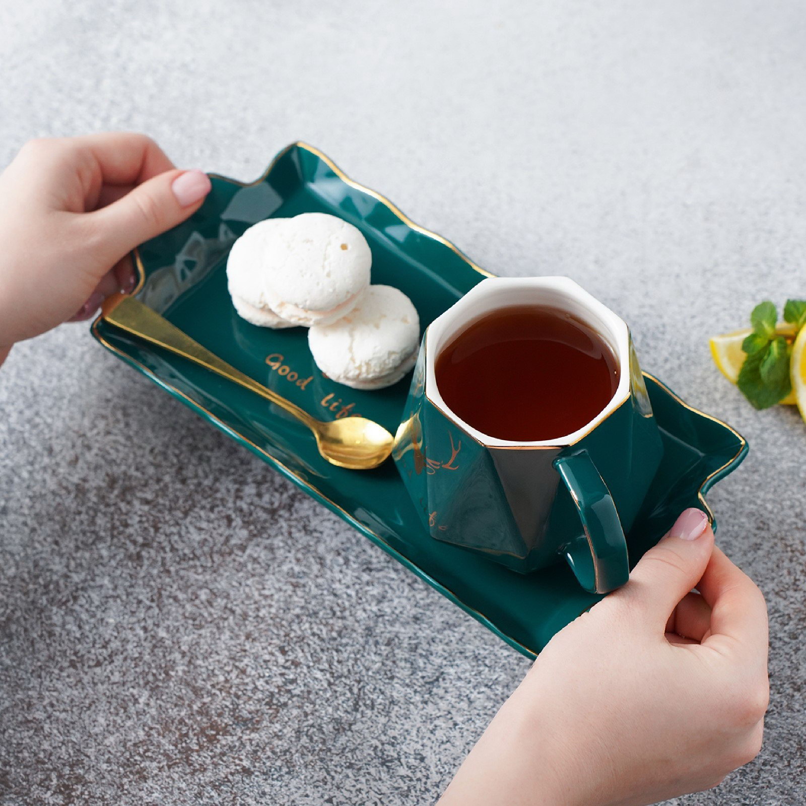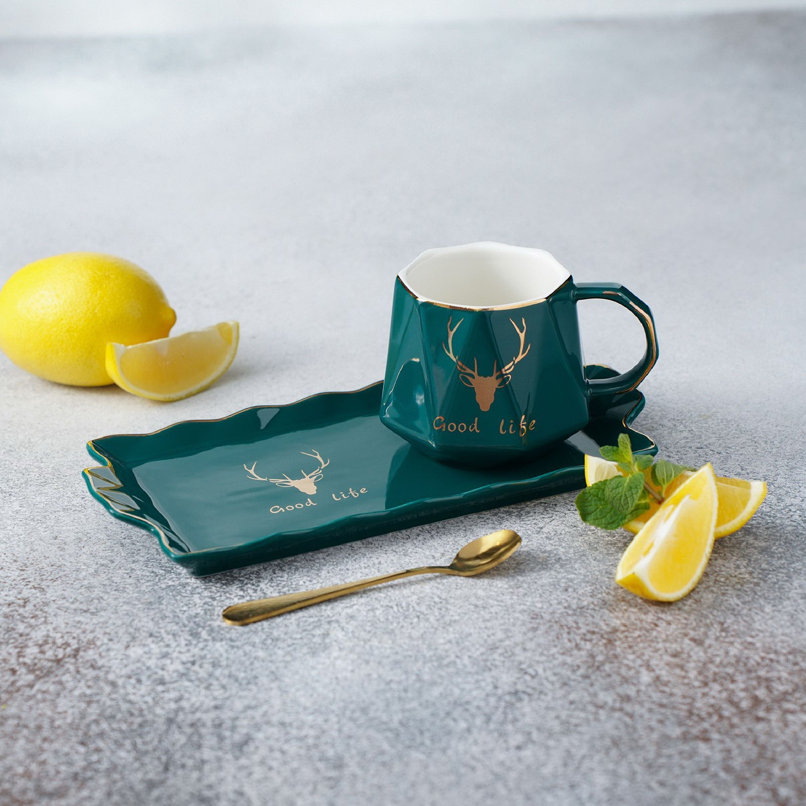 Чайная пара "Золотое копытце", 3 предмета: чашка 320 мл, тарелка 25x12x2 см, ложка, керамика, зелёный, 12x25x9 см., Китай