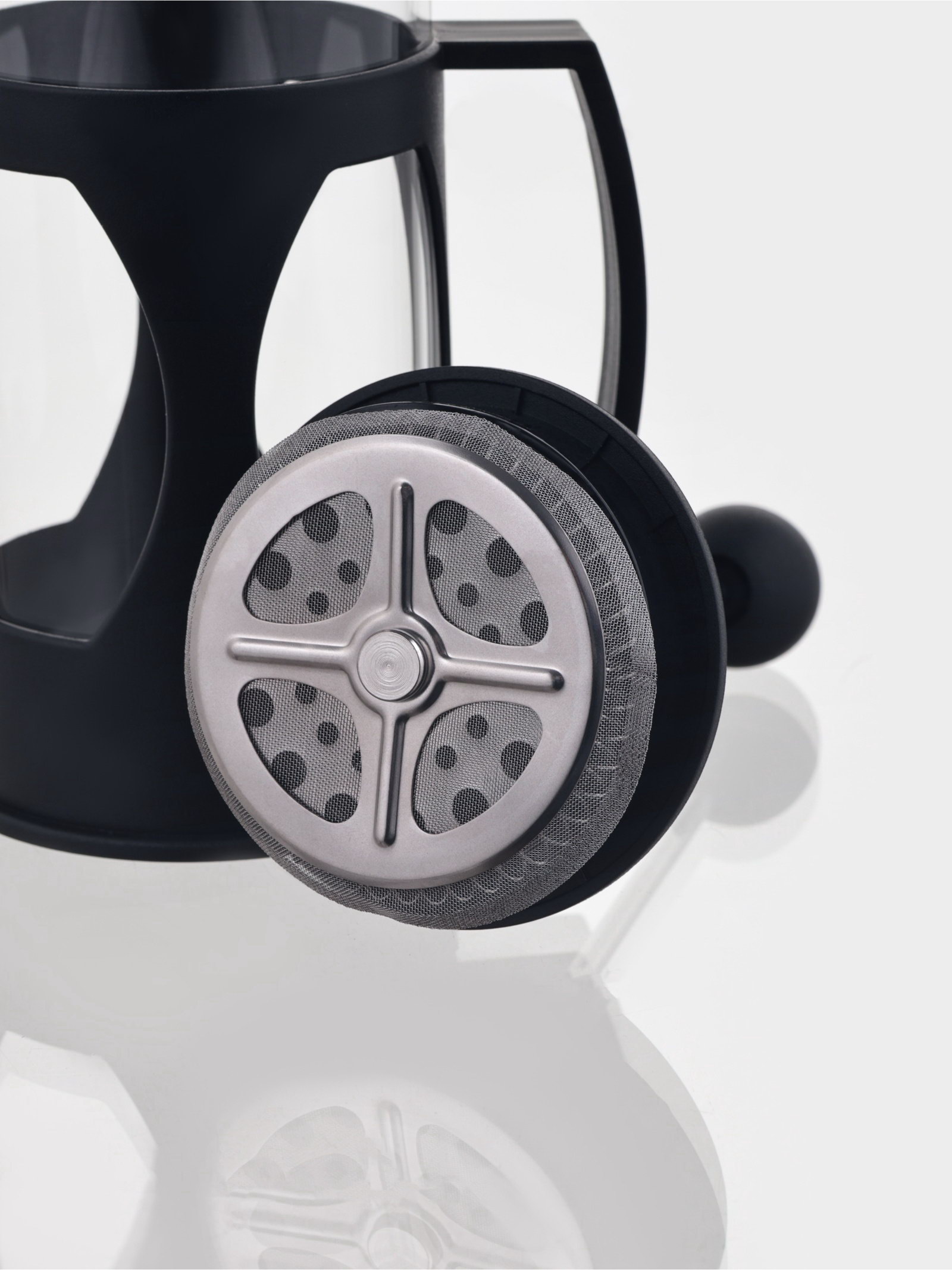 Принцип работы френч-пресса: В колбу засыпают смесь для заваривания, заливают водой, накрывают крышкой и дают настояться несколько минут согласно рецептуре. Когда настой готов, плунжер плавно опускают вниз. Так вся гуща остается под прессом, а вверху получается чистый напиток, который можно разливать по чашкам. | ||