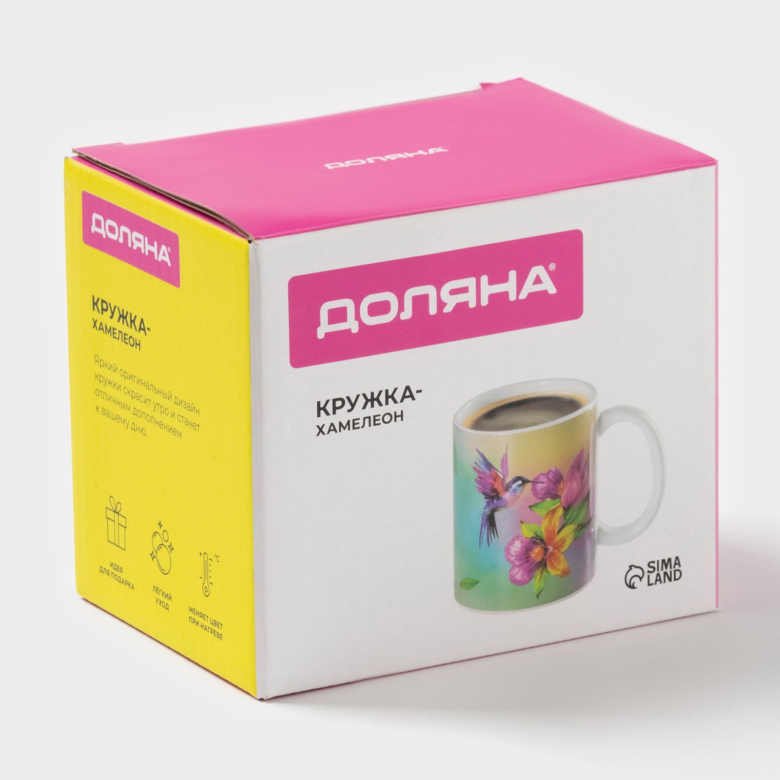 Тематика: Птицы, Цветочно-растительная Размер упаковки: 8.5 x 10.5 x 11.5 см. Высота, см: 9.5 Индивидуальная упаковка: Да tnved: 6912002600 Цвет: Разноцветный Можно использовать в СВЧ-печи: Нет Можно мыть в посудомоечной машине: Нет Тематика праздника: 8 Марта Рисунок: Да Дополнительный аксессуар: Без аксессуаров Особенности: Хамелеон Текстура: Гладкая Матовая поверхность: Нет Запрет реализации по сегментам: 00000000485 В наборе, шт.: 1 Набор: Нет Кружка-хамелеон Доляна "Колибри" не просто приспособление для питья. Это настоящее украшение дома и яркий аксессуар! Налейте горячего чаю, кофе или какао, и кружка сразу поменяет цвет. Вашу оригинальность по достоинству оценят гости, а сам сосуд освежит любой интерьер благодаря смелому дизайну. Создатели не забыли и о практичности: