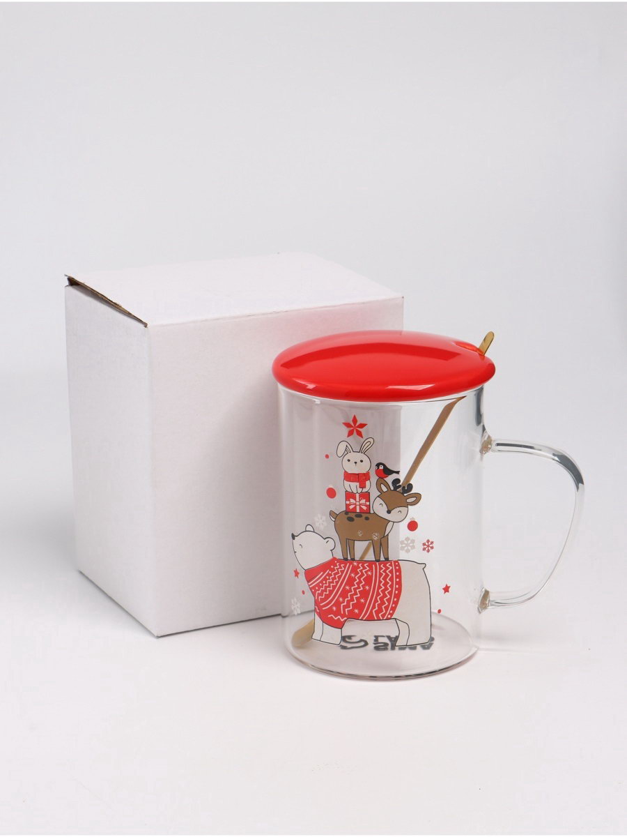 Кружка новогодняя с ложкой и крышкой "Зверята", 470 мл, 8x12.5x12 см., Дорого внимание, Китай