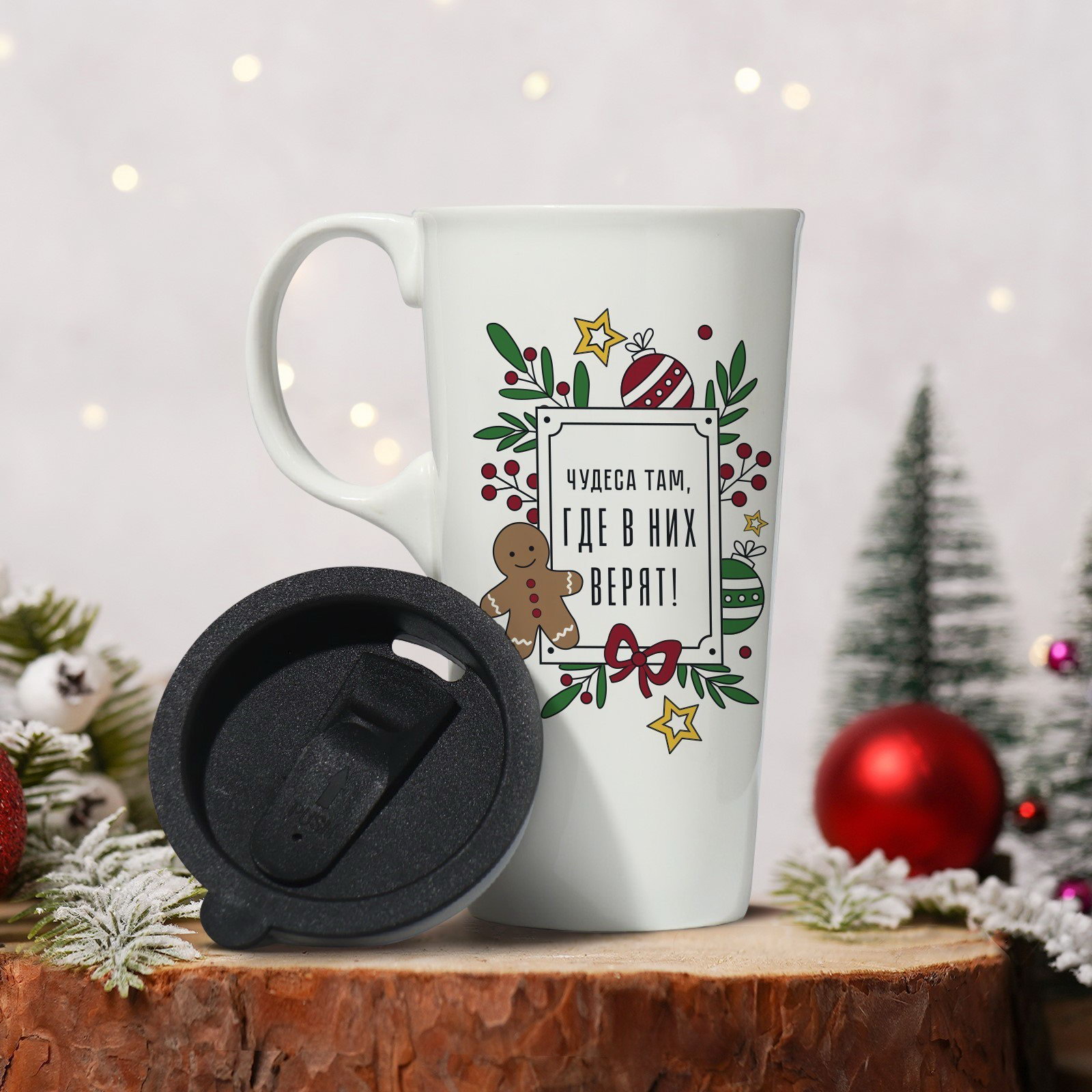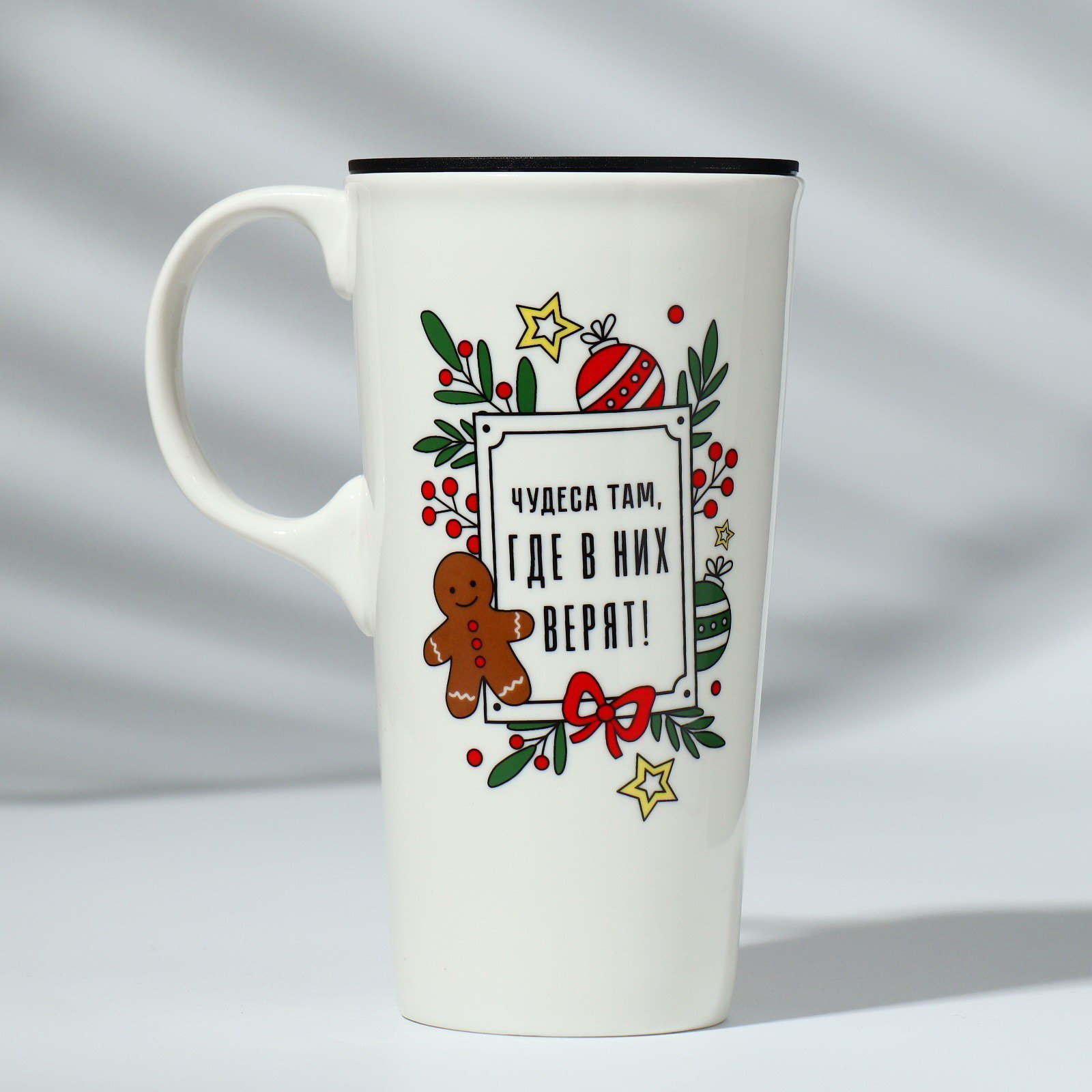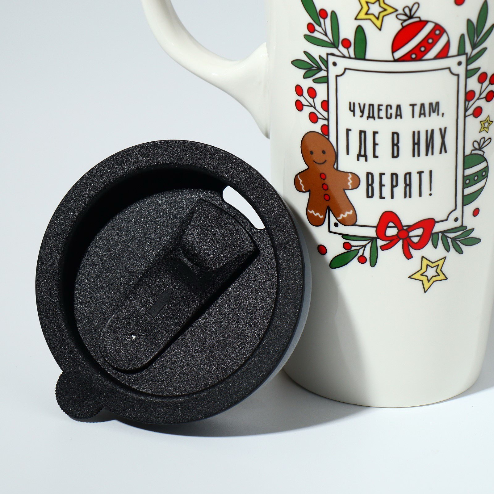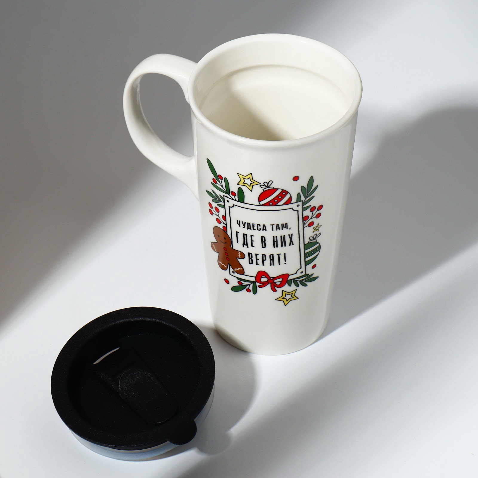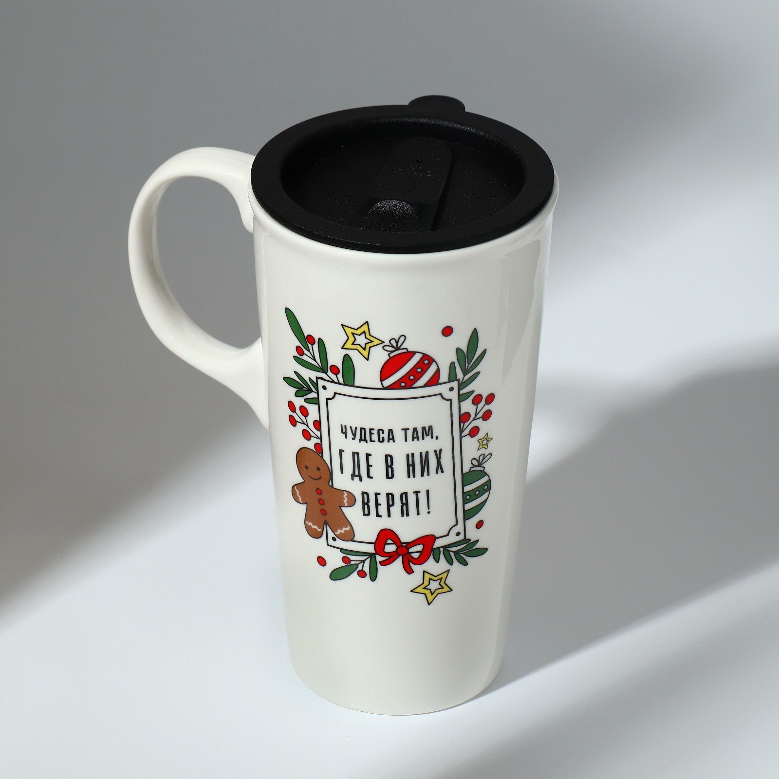 Кружка керамическая с крышкой "Чудеса там, где в них верят", 550 мл, цвет белый, 8.8x16x8.8 см., Дорого внимание, Китай