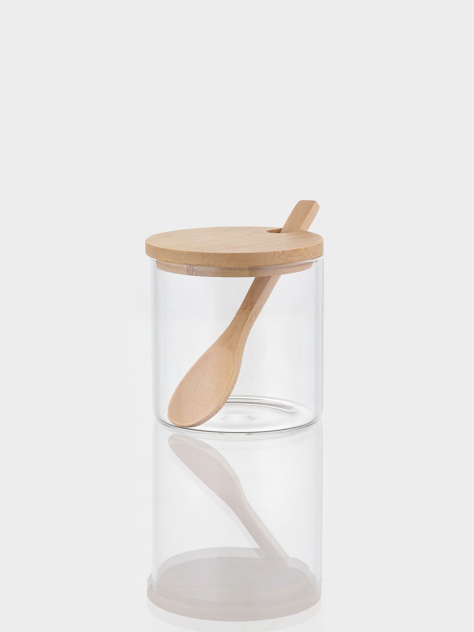 Сахарница Bella Tenero "Эко", 300 мл, 8x8x8.5 см, с бамбуковой крышкой и ложкой, стекло, прозрачная, 8x8x8.5 см., BellaTenero, Китай