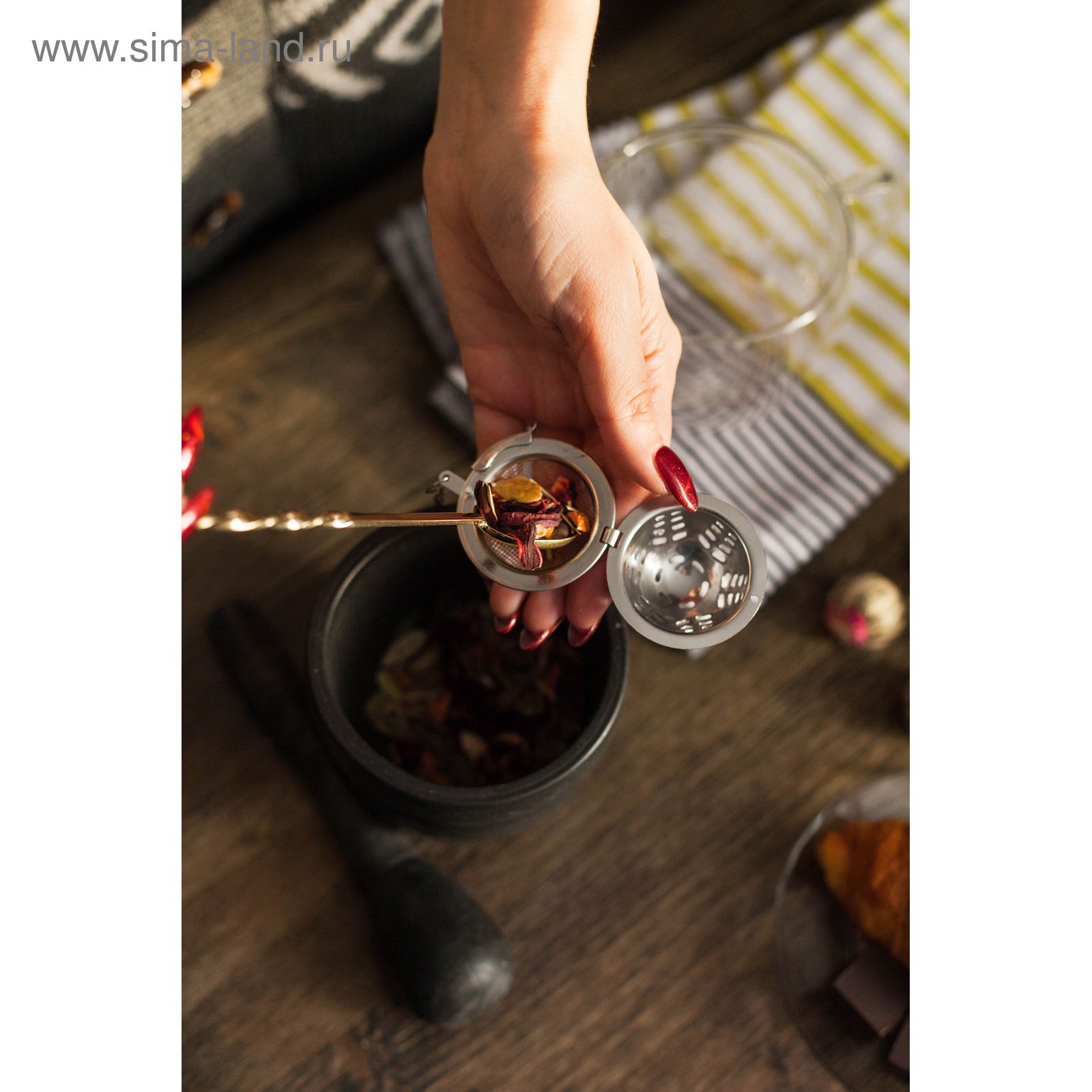 Ситечко выполнено из экологичного материала, оно не вступает в реакцию с жидкостями и не окисляется. Изделие станет отличным аксессуаром на домашнем чаепитии. | ||