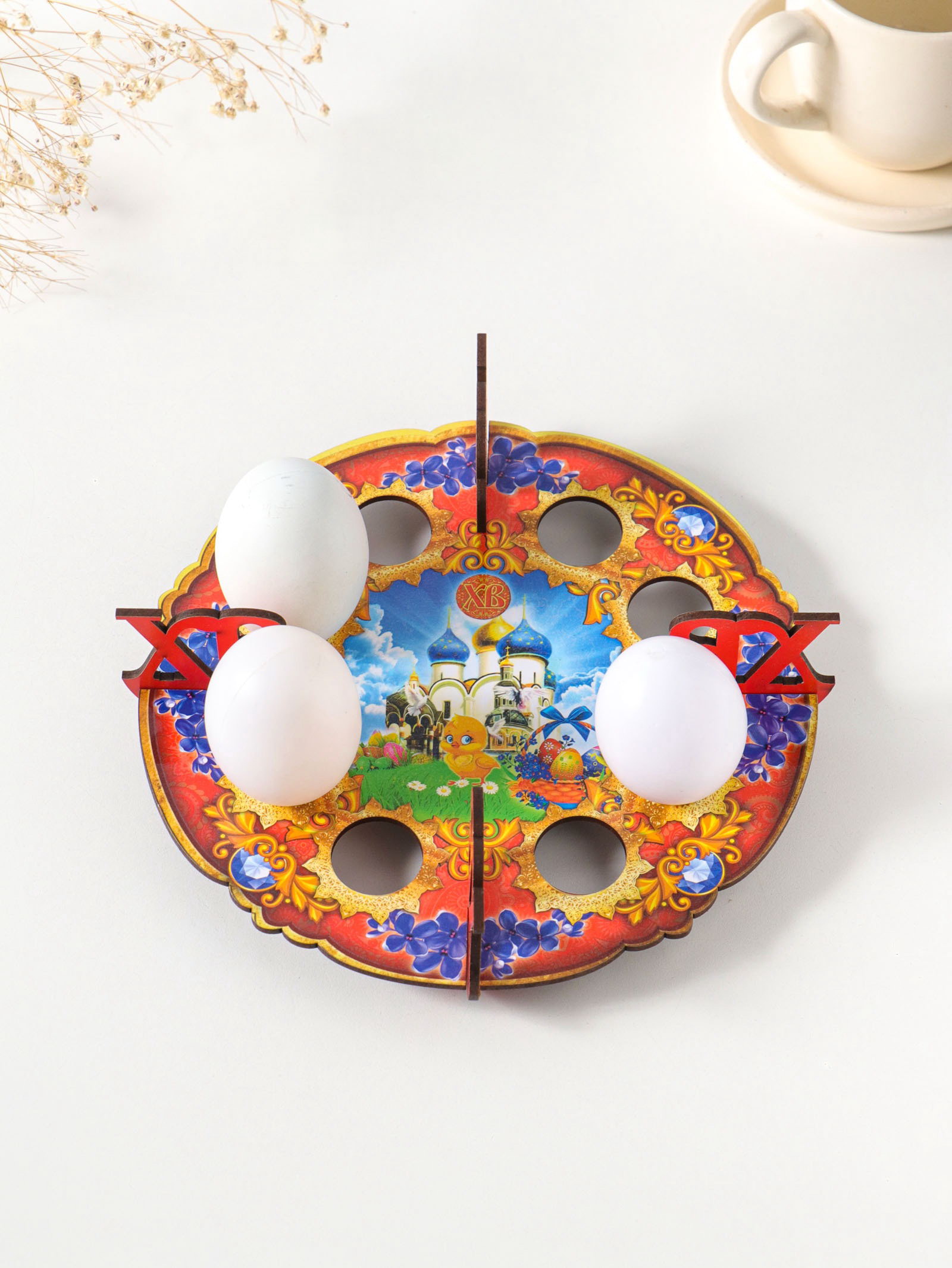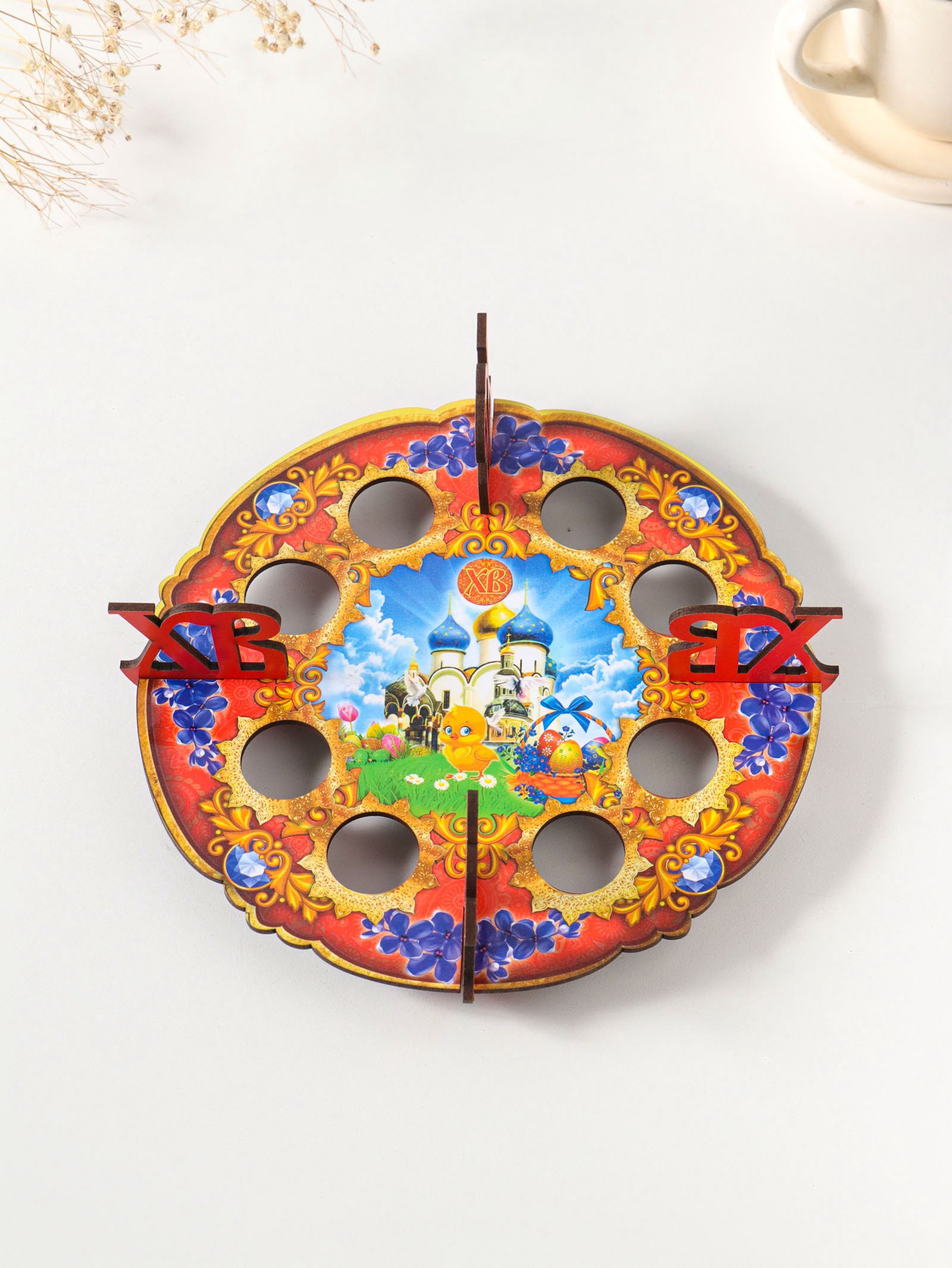 Тематика: Пасхальная, Птицы Размер упаковки: 20 x 0.5 x 20 см. tnved: 4420190000 Температурное ограничение: Нет Количество ячеек: 8 Можно мыть в посудомоечной машине: Нет Цвет: Разноцветный Рисунок: Да Эта яркая подставка для пасхальных яиц станет центром праздничного стола. Восемь аккуратных ячеек надежно удержат крашенки или декоративные яйца, создавая целую композицию. Изделие выполнено из плотной древесноволокнистой плиты с изображением милого цыпленка. Диаметр 20 см идеально подходит для стандартного праздничного сервиза. Особенности