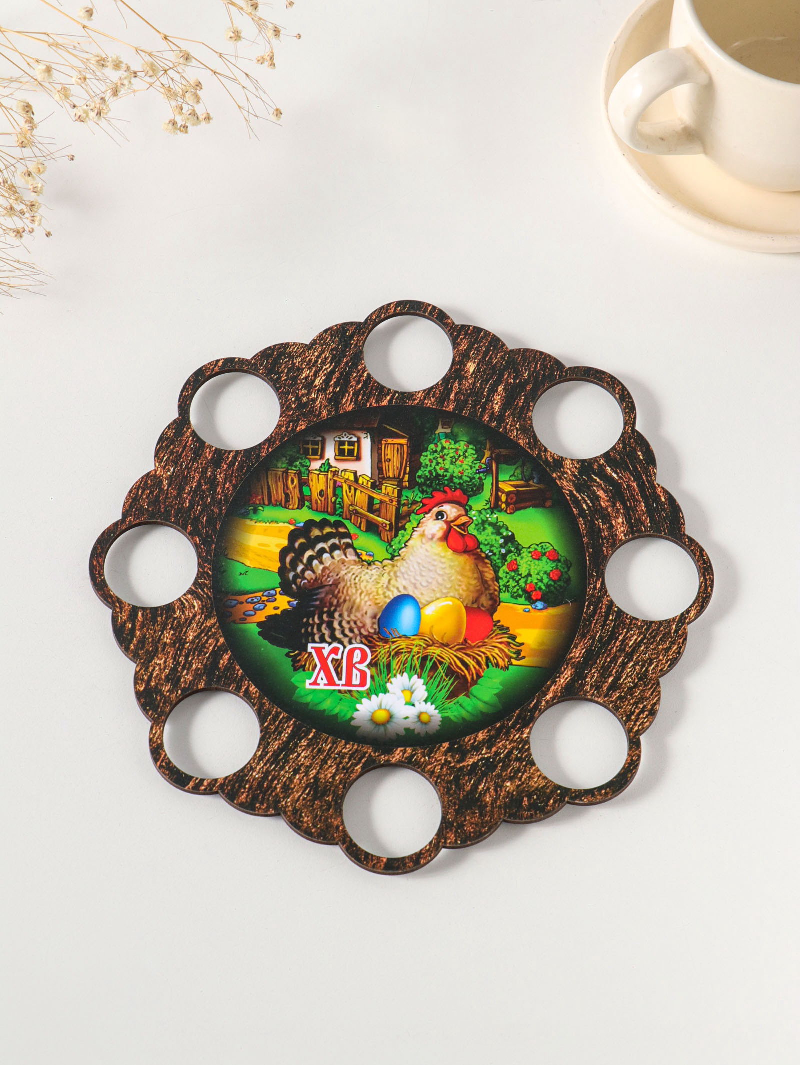 Тематика: Пасхальная, Птицы Размер упаковки: 20 x 0.3 x 20 см. tnved: 4420190000 Температурное ограничение: Нет Можно мыть в посудомоечной машине: Нет Количество ячеек: 8 Цвет: Разноцветный Рисунок: Да Эта пасхальная подставка для яиц станет центральным украшением праздничного стола. Изящная курочка на ножках с восемью аккуратными ячейками создана, чтобы бережно держать крашеные яйца и служить устойчивой основой для кулича. Яркий рисунок на плотном материале передаёт атмосферу весеннего праздника и радует глаз. Особенности