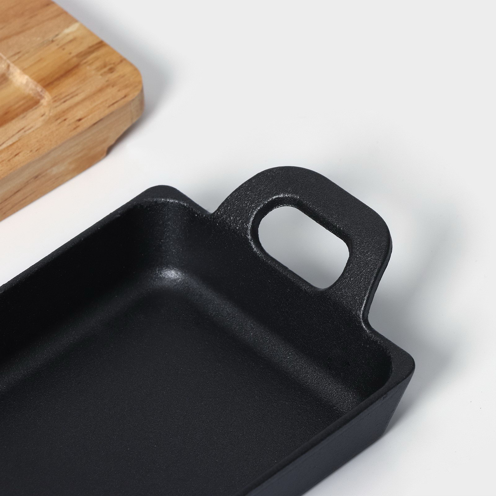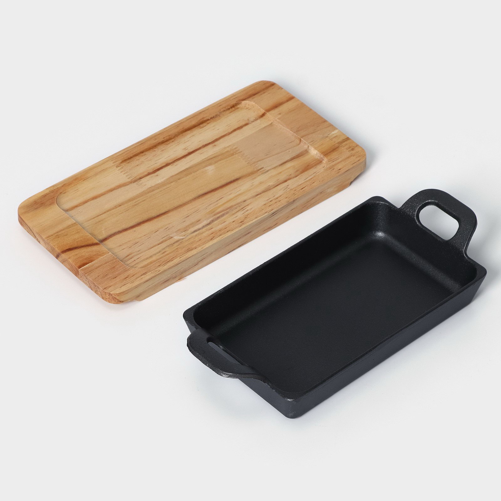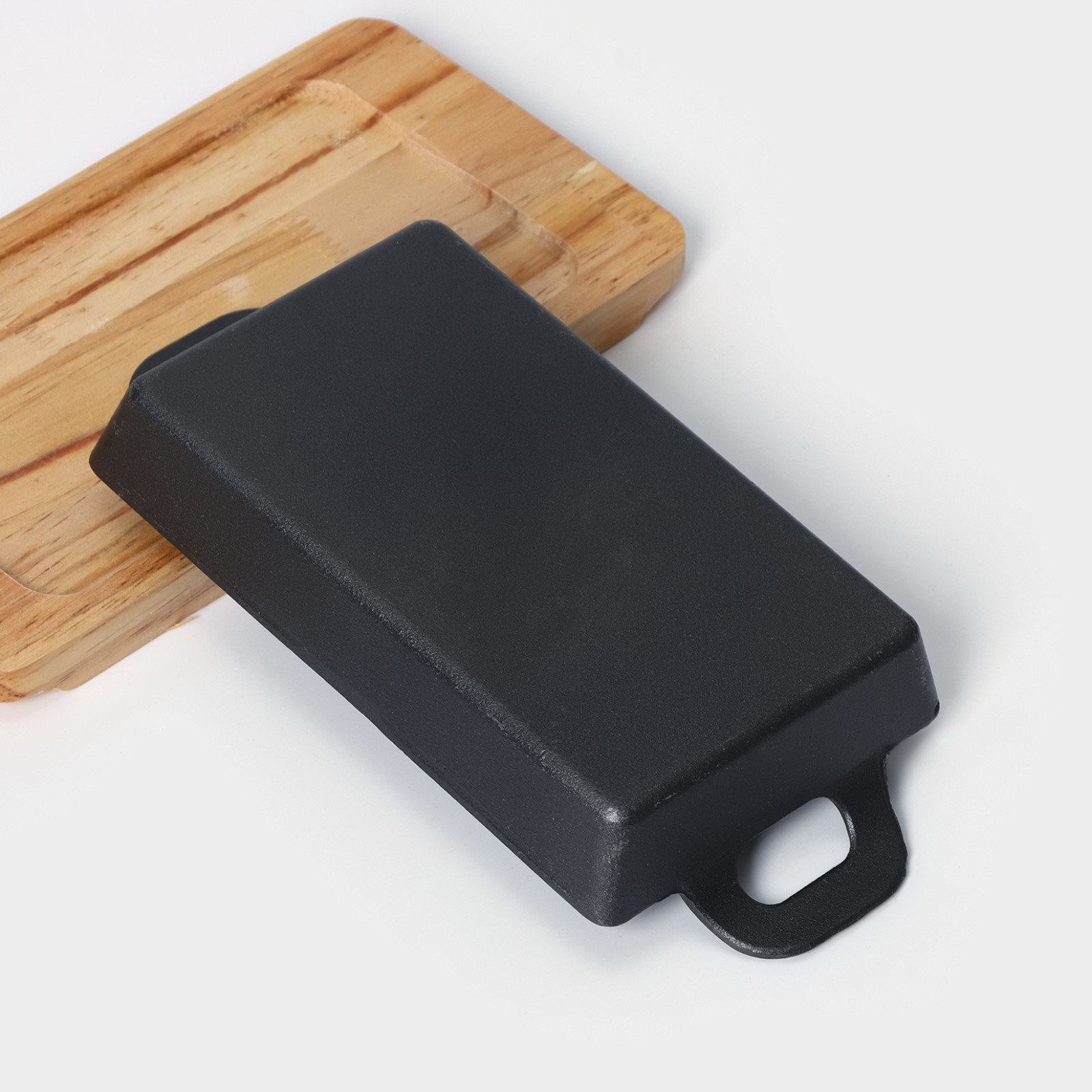 Сковорода чугунная "Прямоугольник", 25x12 см, с ручками, на деревянной подставке, 13.5x25.5x6.5 см., Китай