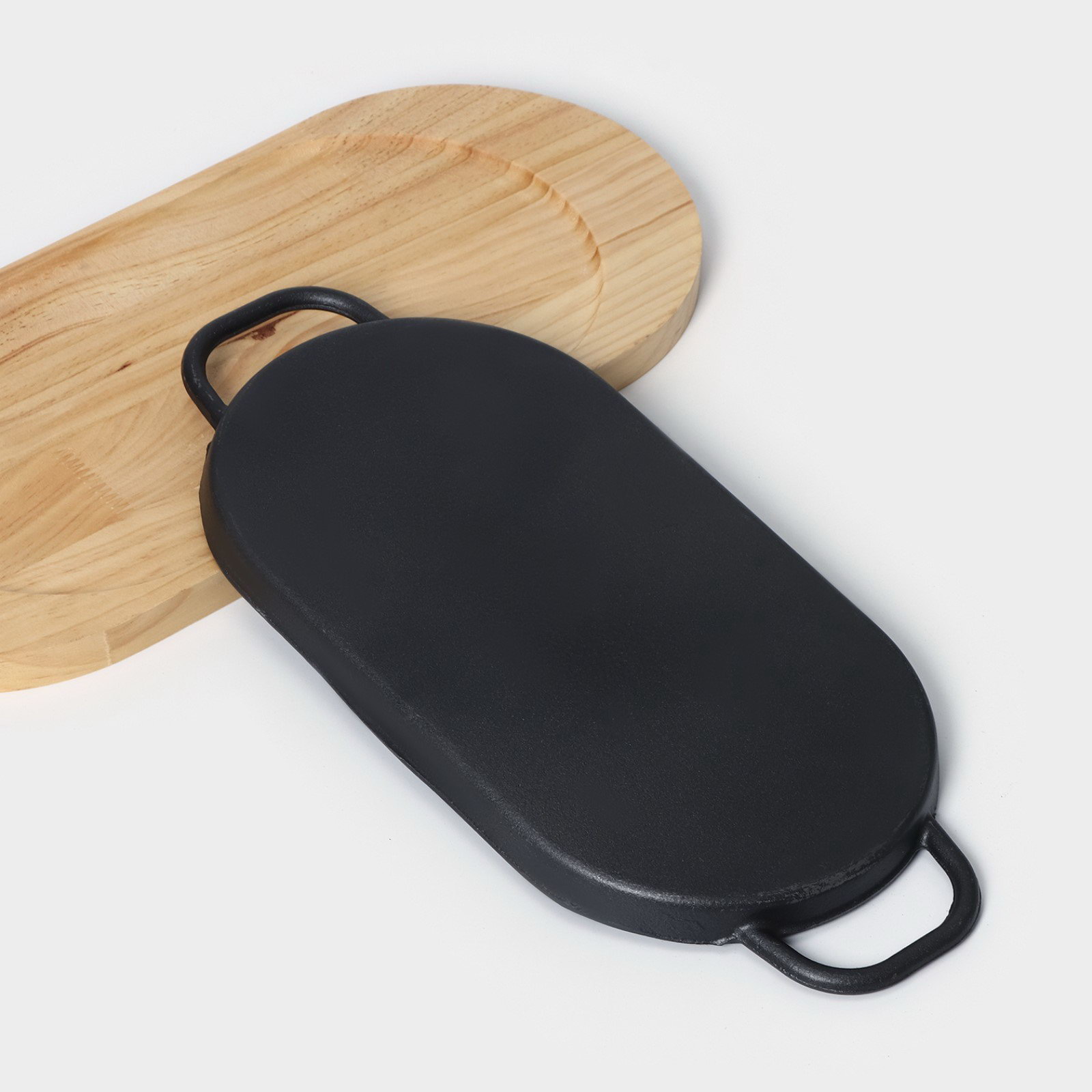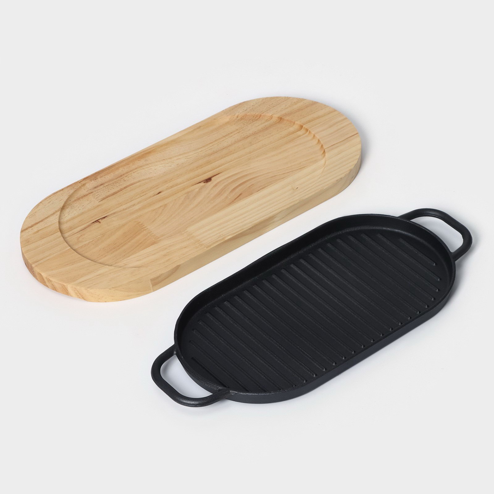 Сковорода чугунная "Овал. Гриль", 37x16.5 см, с ручками, на деревянной подставке, чёрная, 30х30х3.5 см., Китай