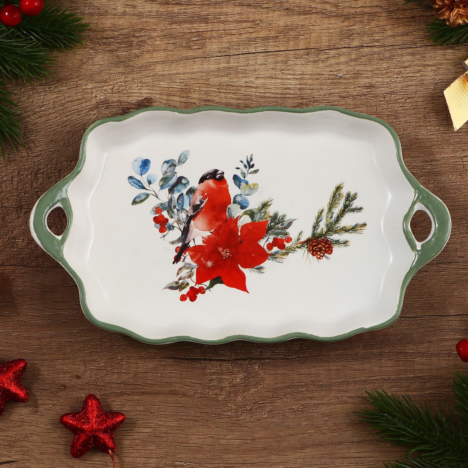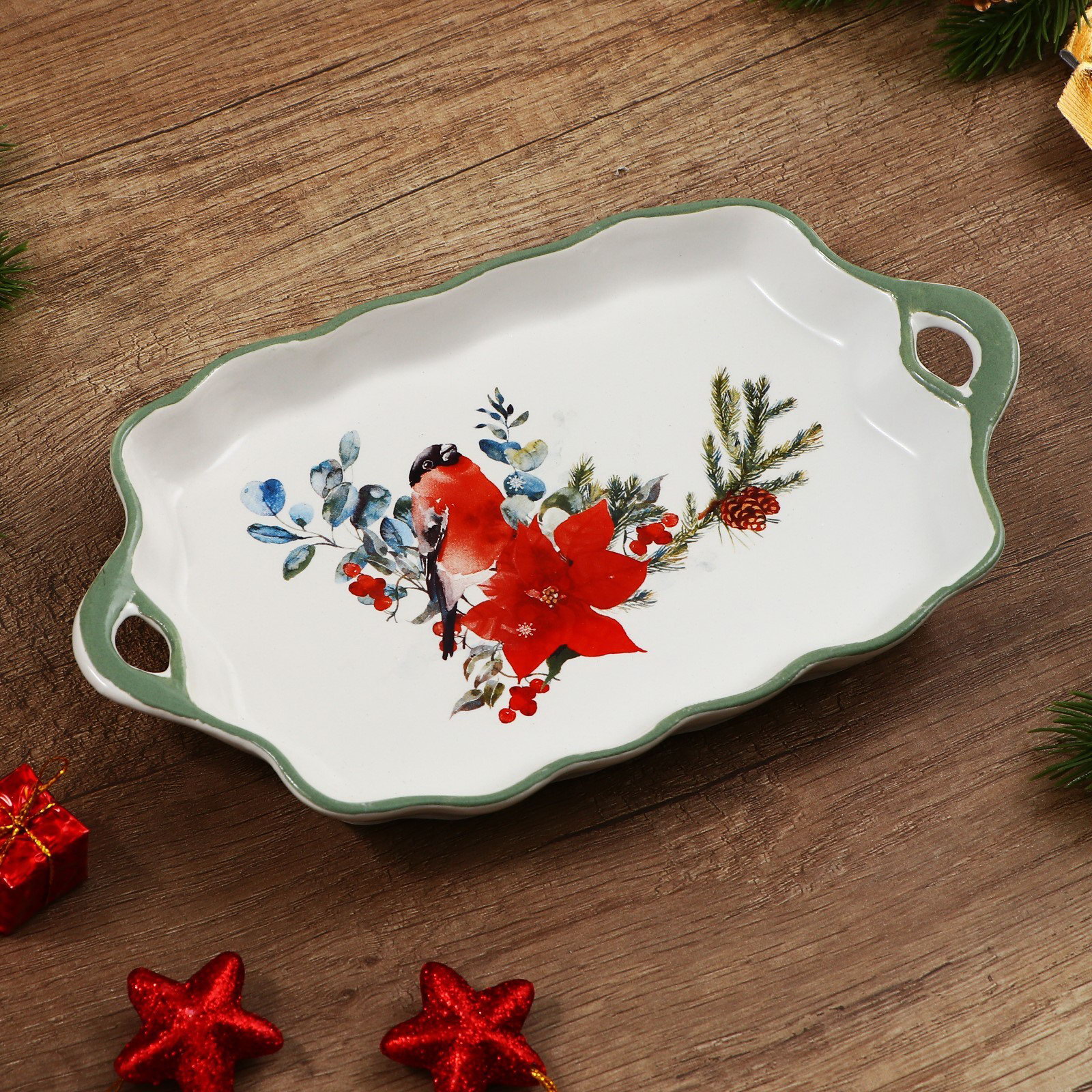 Блюдо новогоднее "Снегирь", 23x13x2.5 см, ручная работа, 13x23x2.5 см., Дорого внимание, Китай
