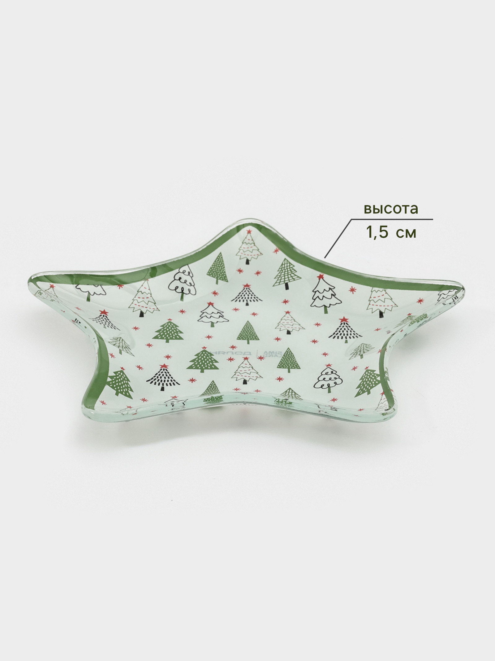 Цвет: Белый, Зелёный Размер упаковки: 2 x 15.5 x 15.5 см. tnved: 7013500000 Можно использовать в СВЧ-печи: Нет Вид тарелки: Плоская Текстура: Гладкая Набор: Нет Особенности: Без особенностей Форма: Звезда Рисунок: Да Символ года: Нет Тематика: Новогодняя Можно мыть в посудомоечной машине: Нет Крышка: Нет Тематика праздника: Новый год Маленькая ёлочка большой праздничный акцент! Сервировочное блюдо стеклянная тарелка в форме звезды диаметром 15 см с новогодним рисунком в бело-зелёной гамме. Оно идеально подходит для подачи мини-закусок, конфет или как самостоятельный декоративный элемент на праздничном столе. Особенности: