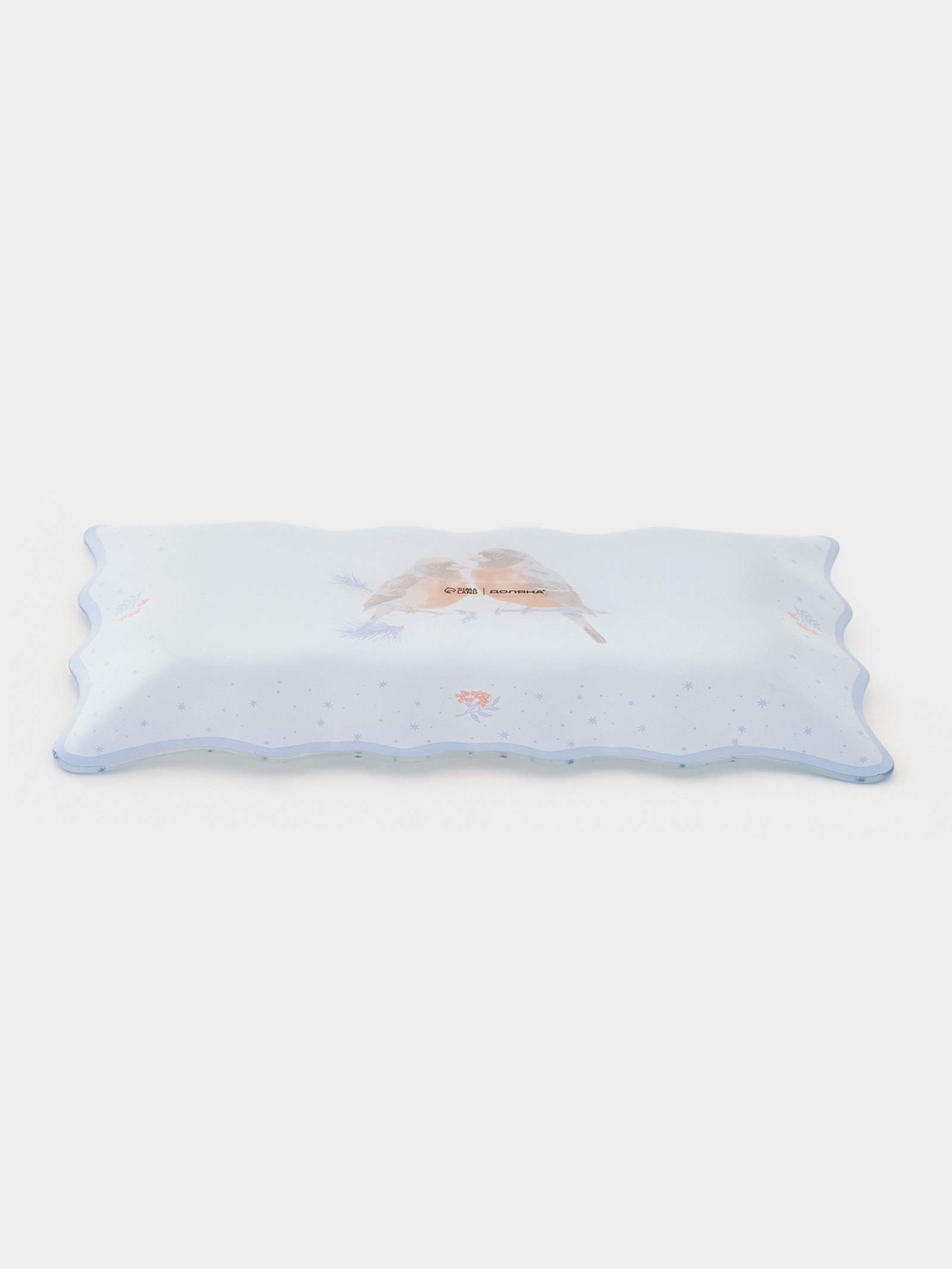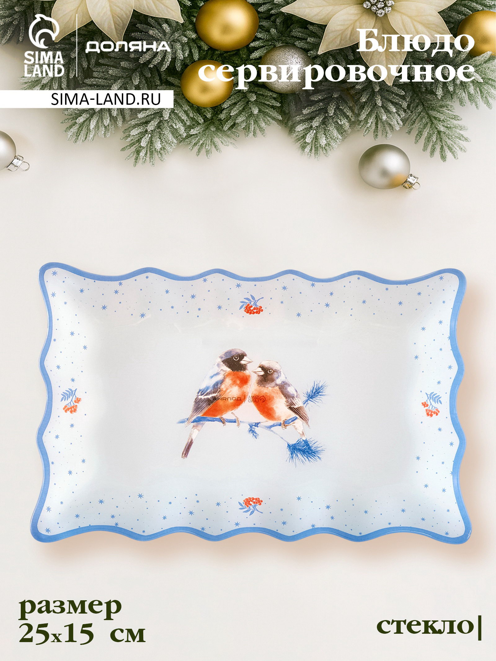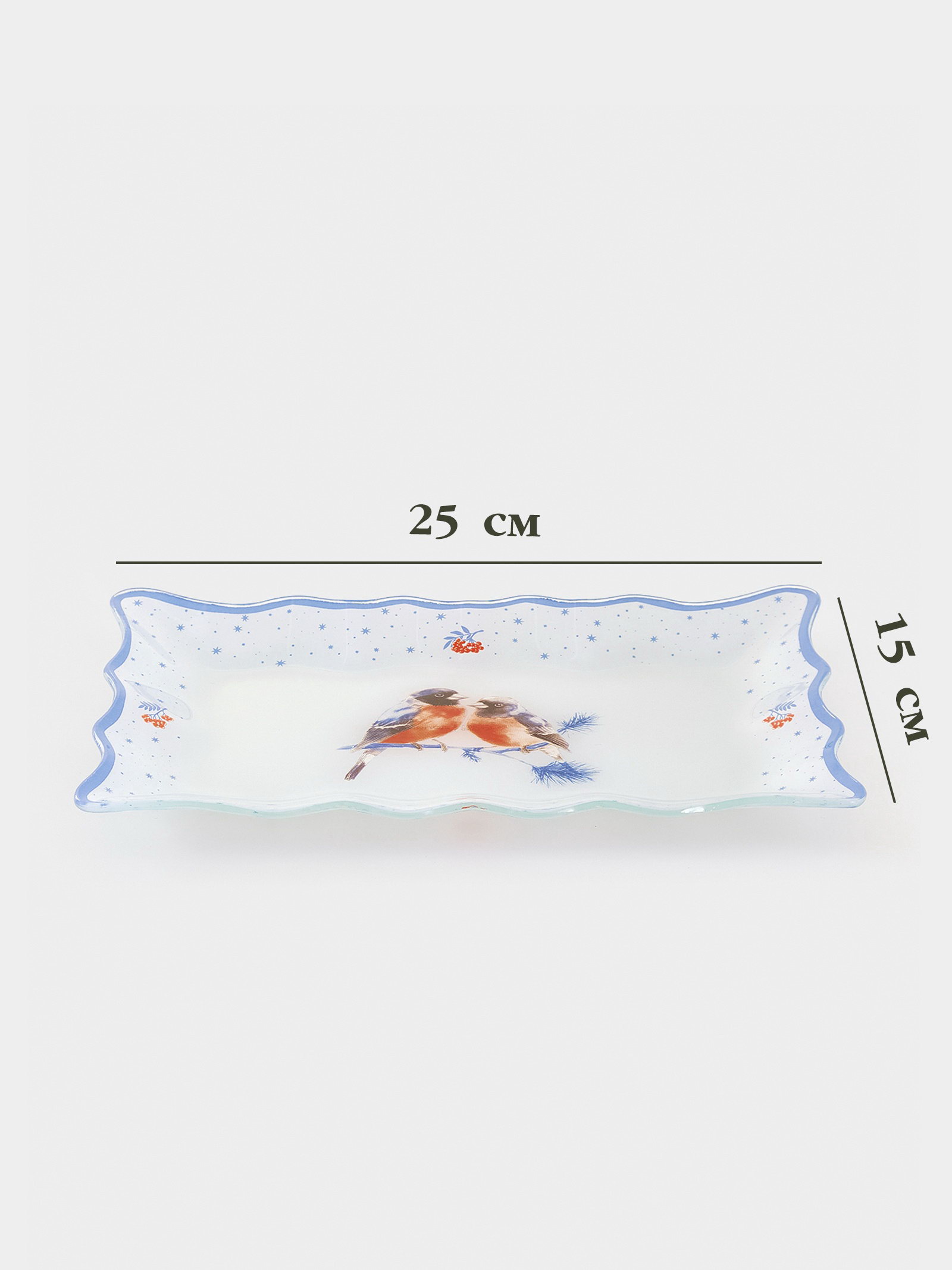 Блюдо сервировочное новогоднее "Снегири на ветке"", 25x16 см, стекло, белое, голубое, 16.3x25x1.8 см., Доляна, Китай