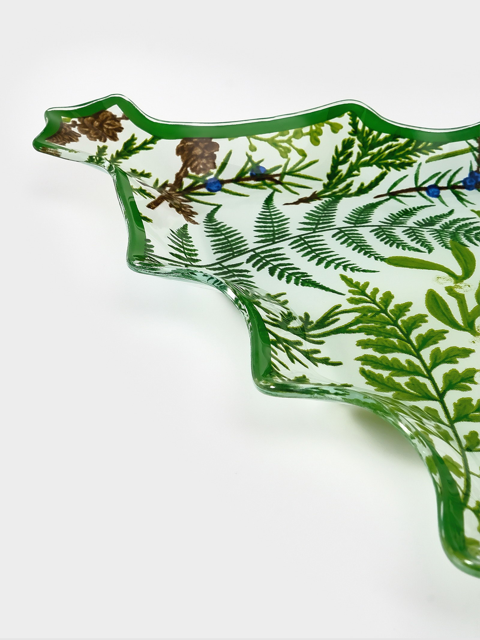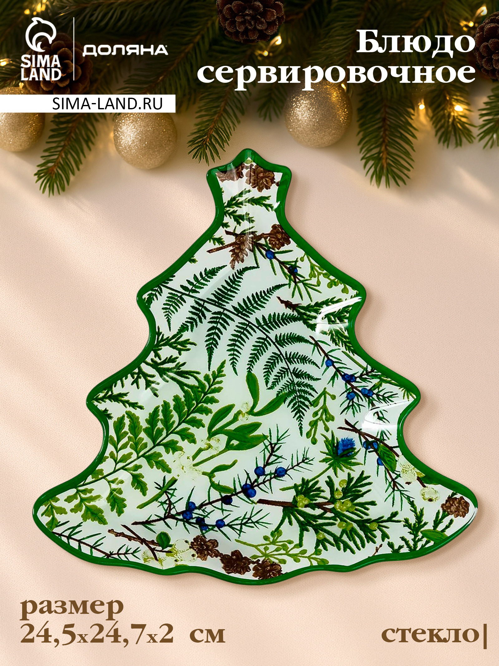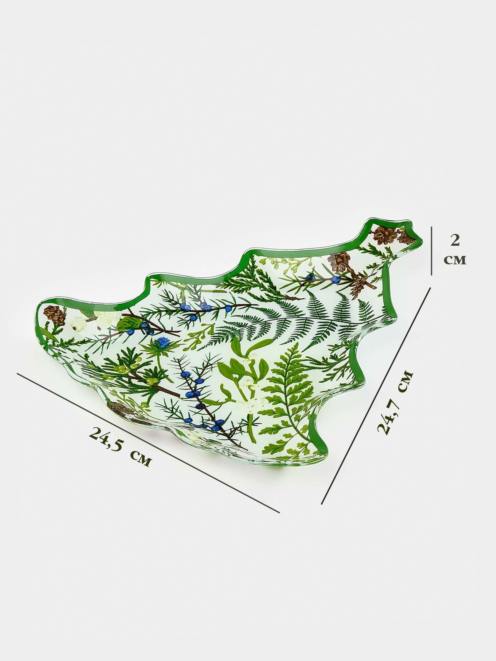 Блюдо сервировочное новогоднее "Еловые ветки", 24.5x24.7x2 см, стекло, белое, зелёное, 24.7x24.5x2 см., Доляна, Китай