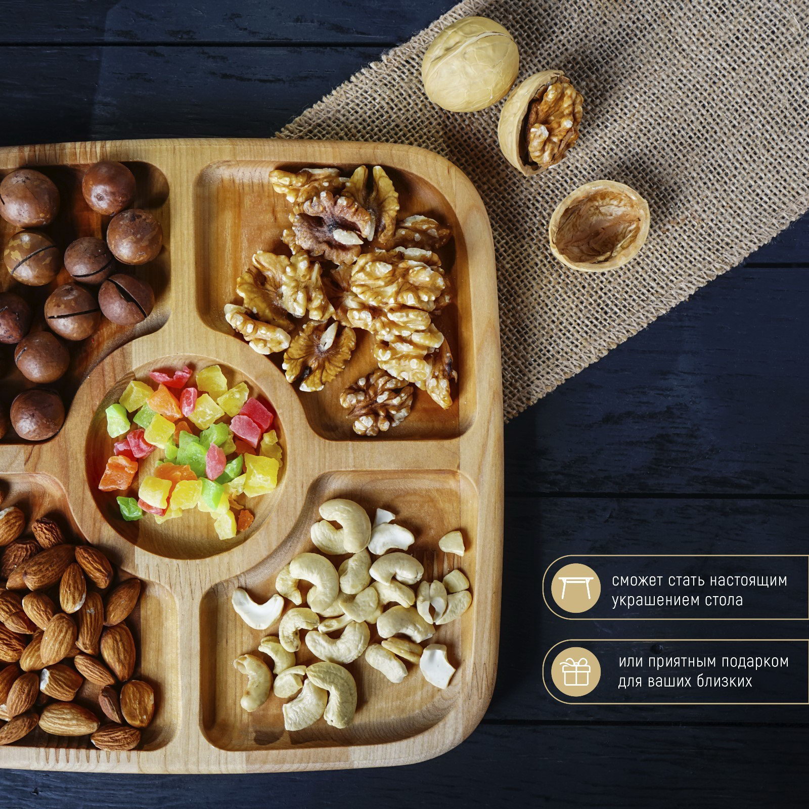 Размер упаковки: 25 x 2 x 25 см. Можно мыть в посудомоечной машине: Нет Форма: Квадрат Из натурального дерева: Да Из натурального дерева: Да tnved: 4419900000 Вид дерева: Берёза Температурное ограничение: Нет Рисунок: Нет Цвет: Бежевый Количество ячеек: 5 Посуда в комплекте: Нет Тематика: Однотонная Набор: Нет Никак не можете отучить себя от вредных перекусов? Изящная менажница из натурального дерева не даст вам пройти мимо орешков и сухофруктов. Изделие станет стильным и уютным элементом вашей кухни и незаменимым аксессуаром для сервировки стола. Правила ухода