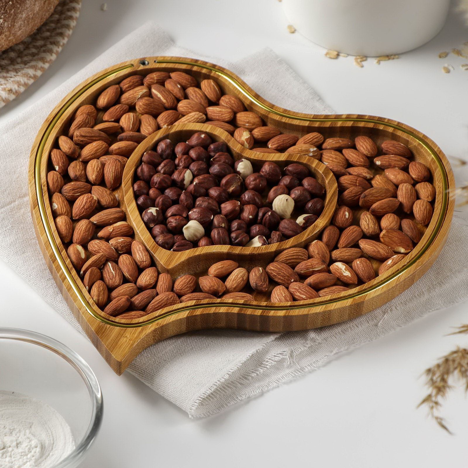 Размер упаковки: 27 x 2 x 27 см. Вид тарелки: Плоская Можно мыть в посудомоечной машине: Нет Набор: Нет Можно использовать в СВЧ-печи: Нет Форма: Сердце Форма: Сердце tnved: 4419190000 Рисунок: Нет Цвет: Бежевый Тематика праздника: 14 Февраля Количество ячеек: 2 Тематика: Однотонная Никак не можете отучить себя от вредных перекусов? Изящная менажница из натурального дерева не даст вам пройти мимо орешков и сухофруктов. Изделие станет стильным и уютным элементом вашей кухни и незаменимым аксессуаром для сервировки стола. Правила ухода