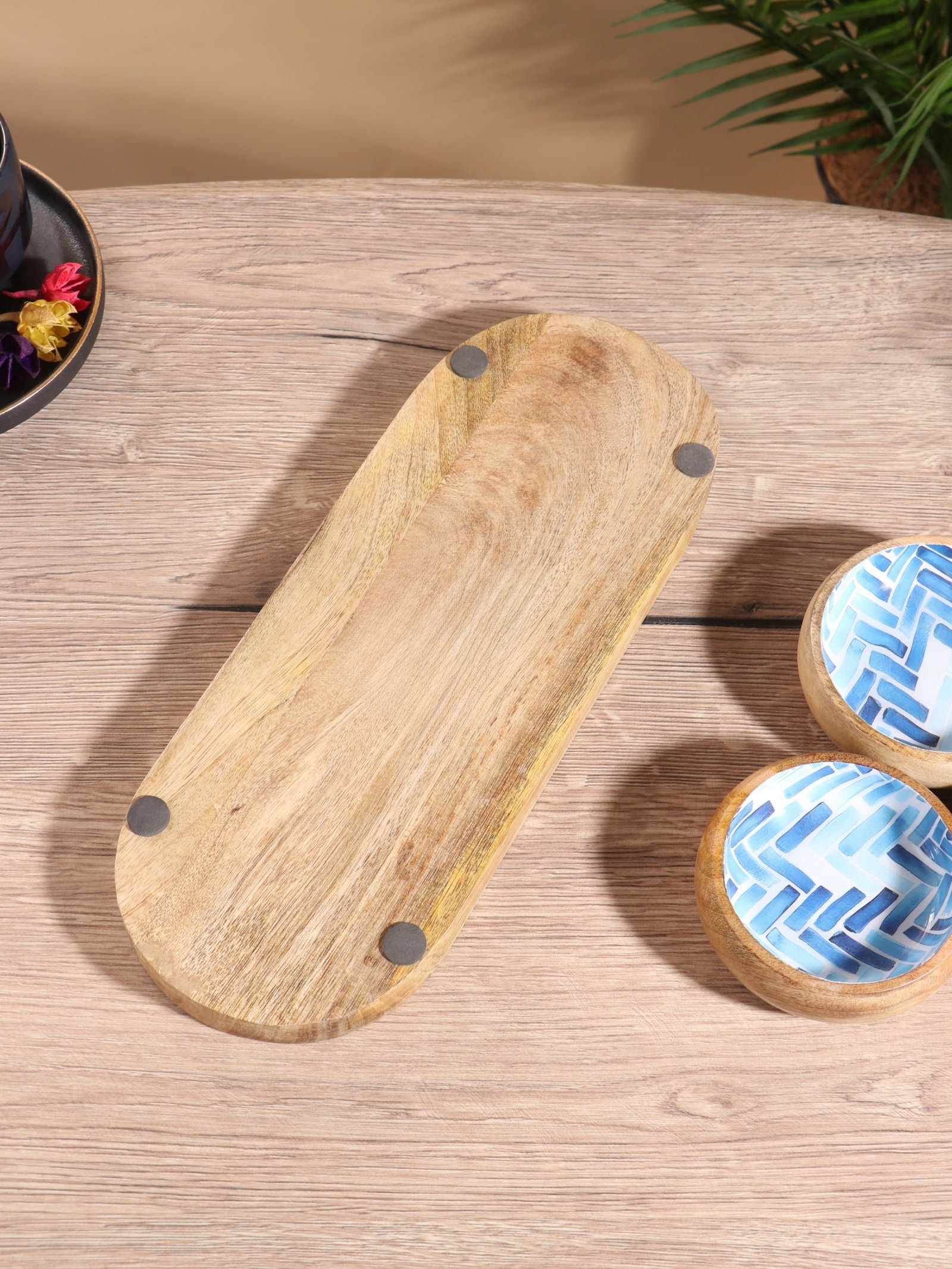 Набор розеток на подносе "Синяя мозайка", 3 шт., 33.5x13x6.5 см, дерево манго, 13x33.5x6.5 см., Индия