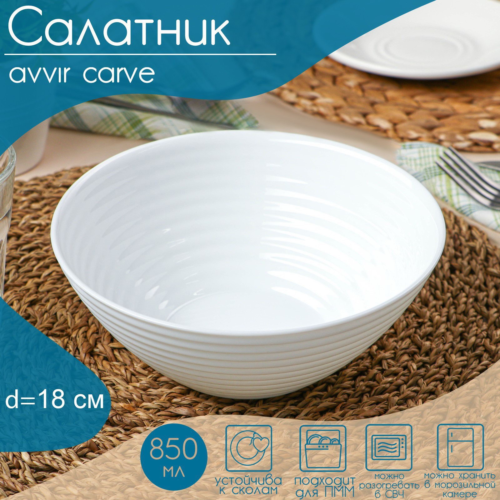 Салатник Carve, 850 мл, d=18 см, стеклокерамика, цвет белый, 18х18х7 см., Avvir, Китай