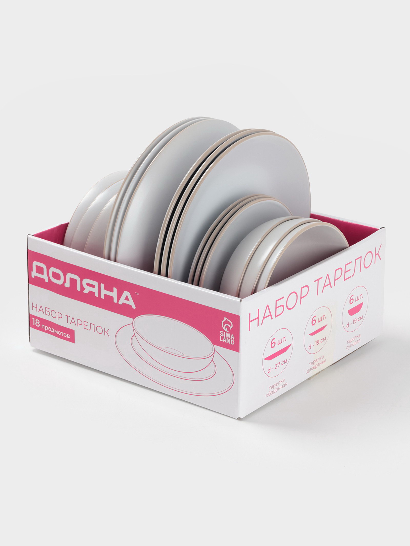 Тарелки "Ваниль", 18 предметов: 6 тарелок d=19 см, 6 тарелок d=27 см, 6 мисок d=19 см, керамика, белые, 32x58x29 см., Доляна, Китай