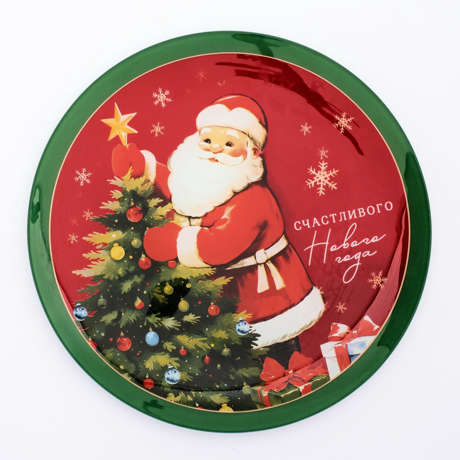 Цвет: Зелёный, Красный Размер упаковки: 21 x 21 x 2 см. Набор: Нет Рисунок: Да Форма: Круг Вид тарелки: Плоская Текстура: Гладкая Можно использовать в СВЧ-печи: Да Можно мыть в посудомоечной машине: Да Тематика: Новогодняя Для горячего: Да Символ года: Нет Символ года: Нет tnved: 7013500000 Запрет реализации по сегментам: 00000000534 Тематика праздника: Новый год Особенности: Цифровая печать Новогодняя стеклянная тарелка диаметром 20 см идеальный выбор для сервировки стола. Преимущества: