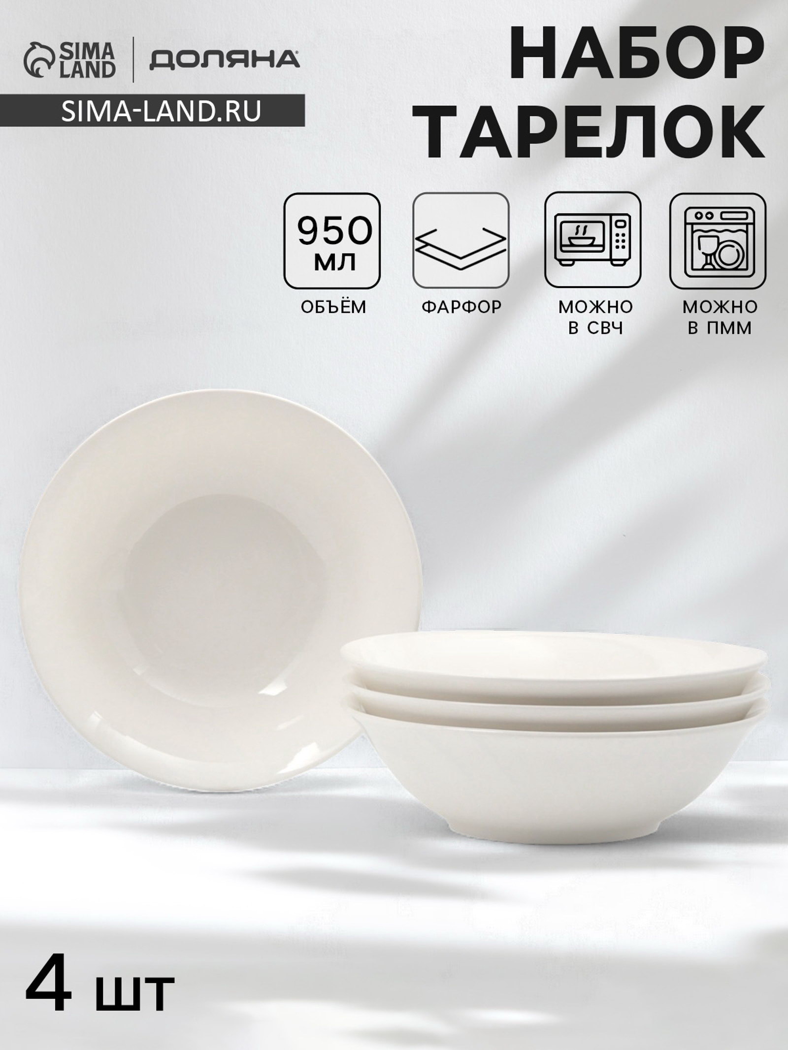 Тарелки глубокие White Label, набор 4 шт., 950 мл, 20x6.5 см, фарфор, белые, 20х20х6.4 см., Доляна, Китай