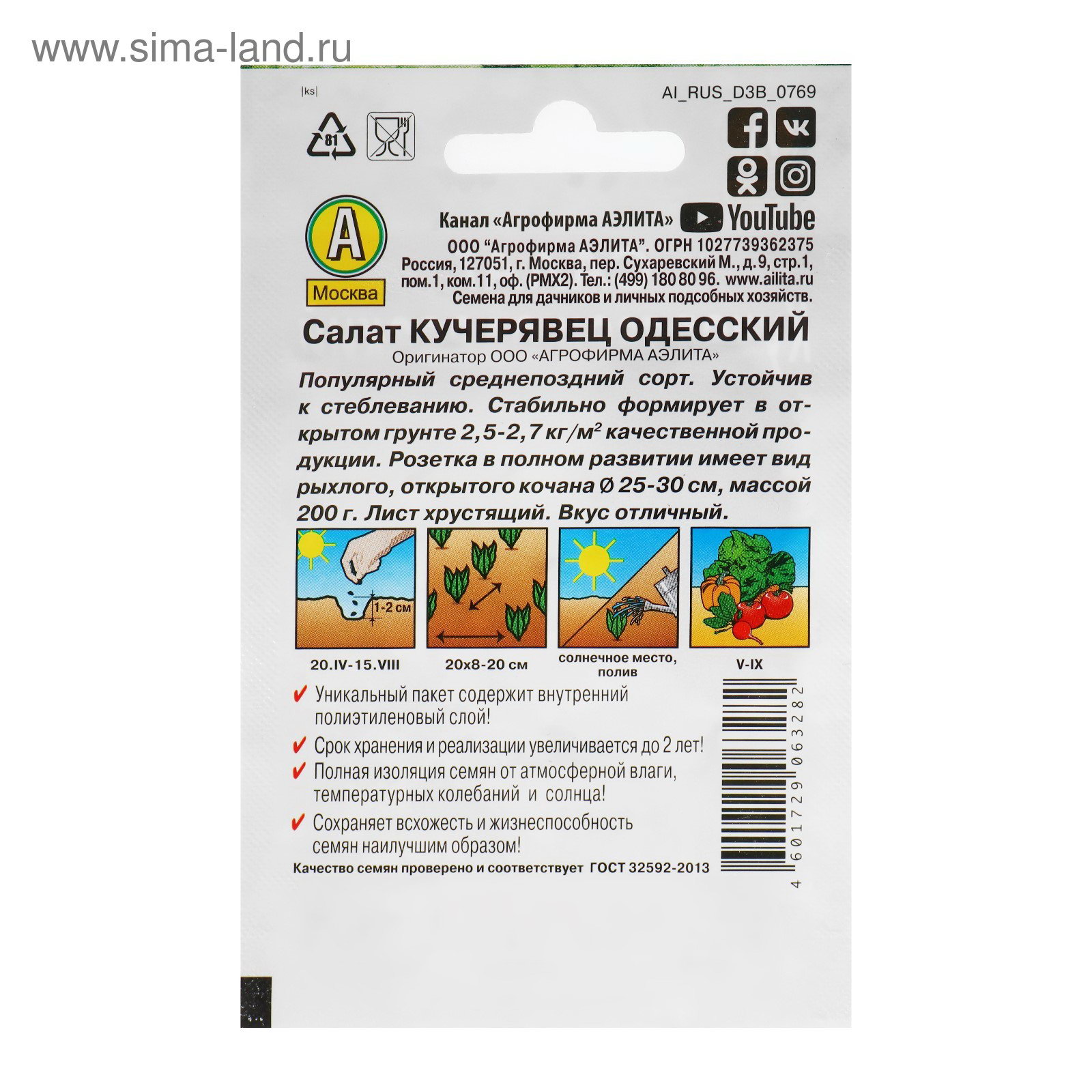 Посев (посадка) в грунт: Август, Апрель, Июль, Июнь, Май Урожай: Август - Сентябрь, Апрель - Май, Июнь - Июль Размер упаковки: 7.5 x 12 x 0.1 см. tnved: 1209999900 tnved: 1209999900 Сроки созревания: Среднепоздний Вид: Салат Упаковка: Цветная Сорт или гибрид: Сорт Высота, см: 20 Место выращивания: Открытый грунт "Кучерявец Одесский" это полукочанный среднеспелый сорт салата, у которого период от всходов до сбора урожая составляет 60–75 дней. Он холодостойкий, устойчив к цветушности. Нежные и сочные бледно-зелёные листья имеют отличный вкус. Масса растения достигает 200 гр | ||