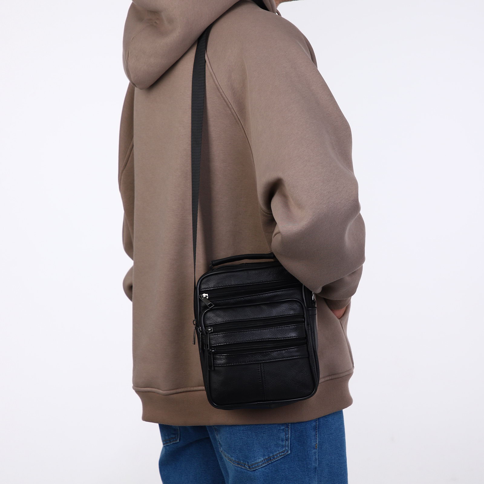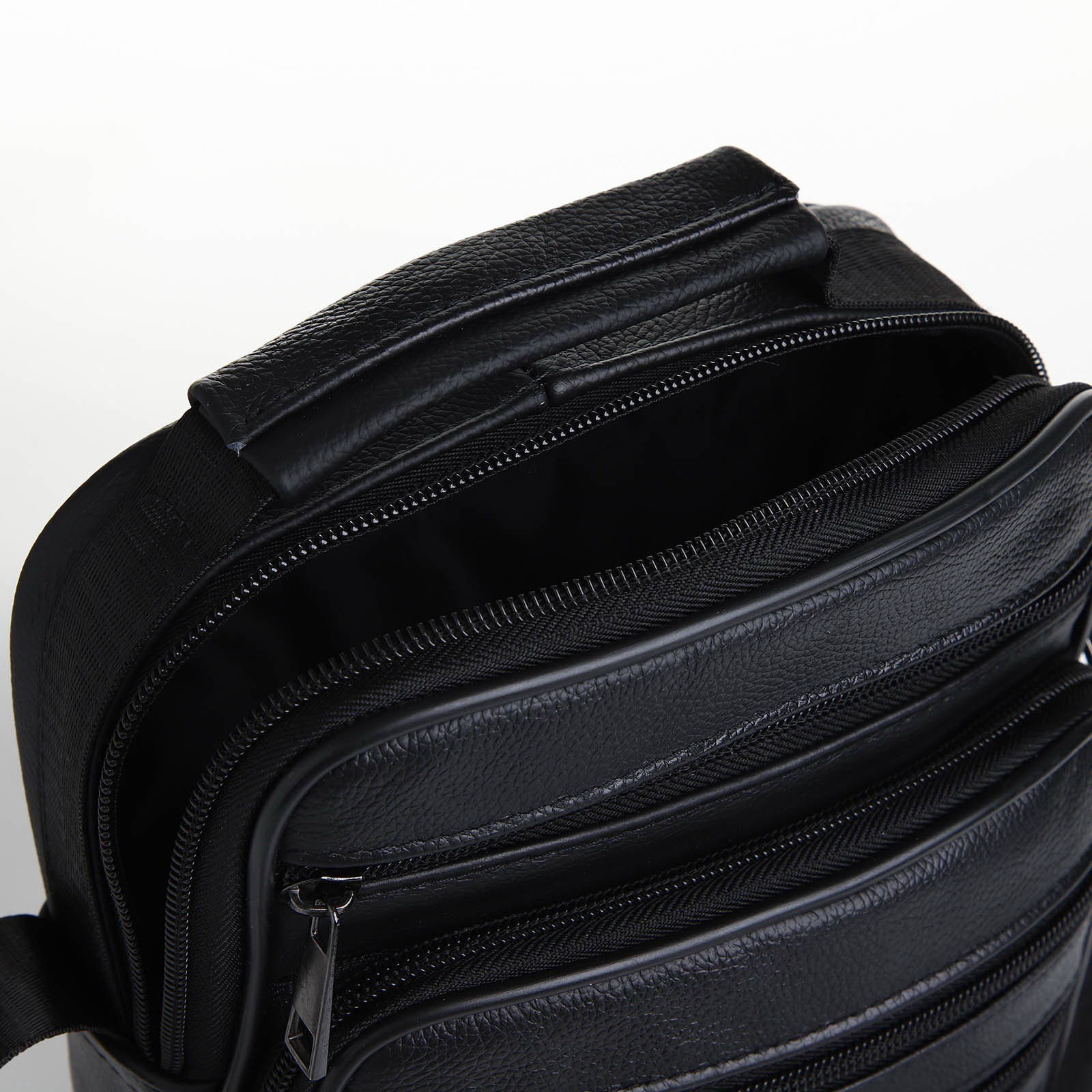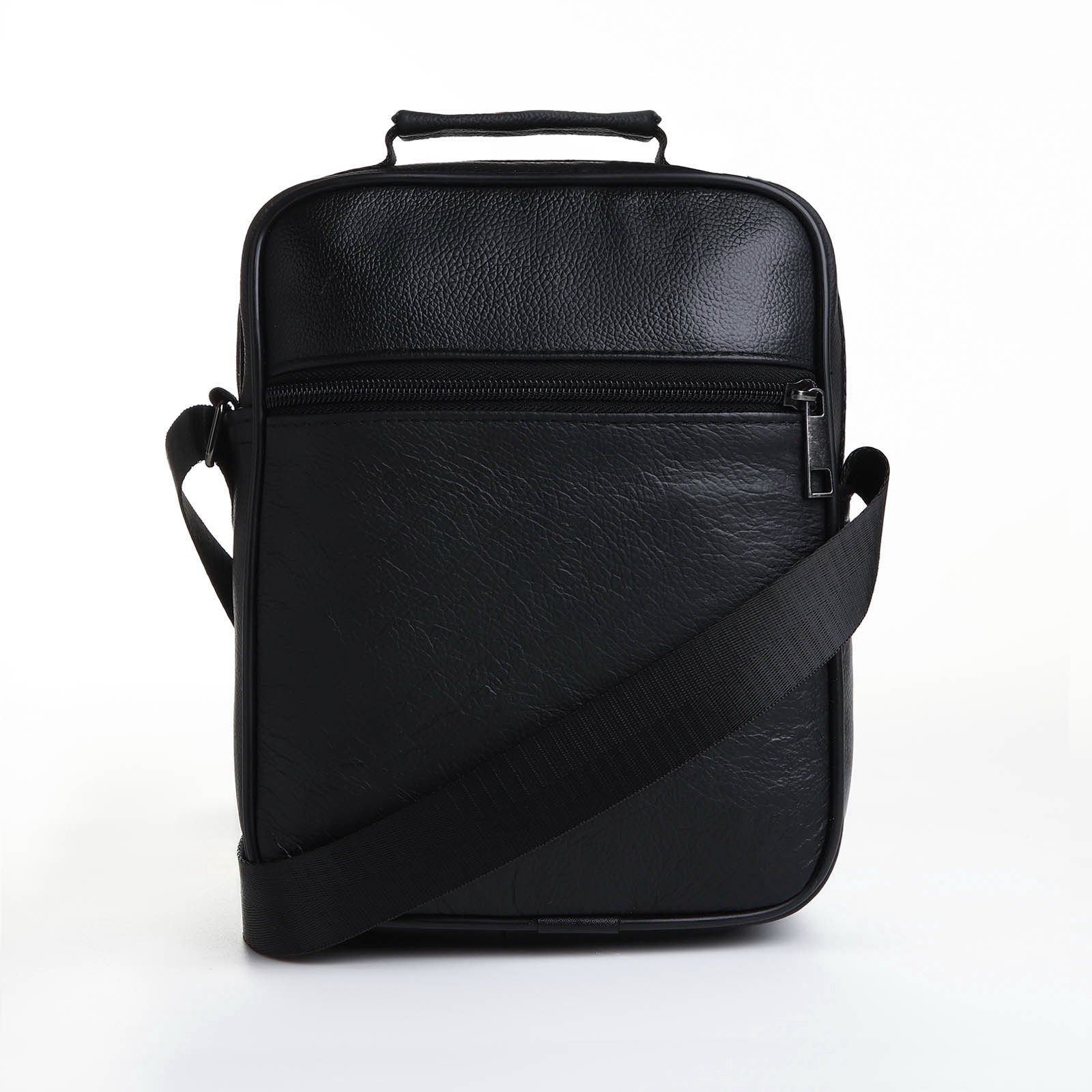 Сумка мужская на молнии, 5 наружных кармана, с ручкой, длинный ремень, чёрная, 8.5x18x22 см., Китай
