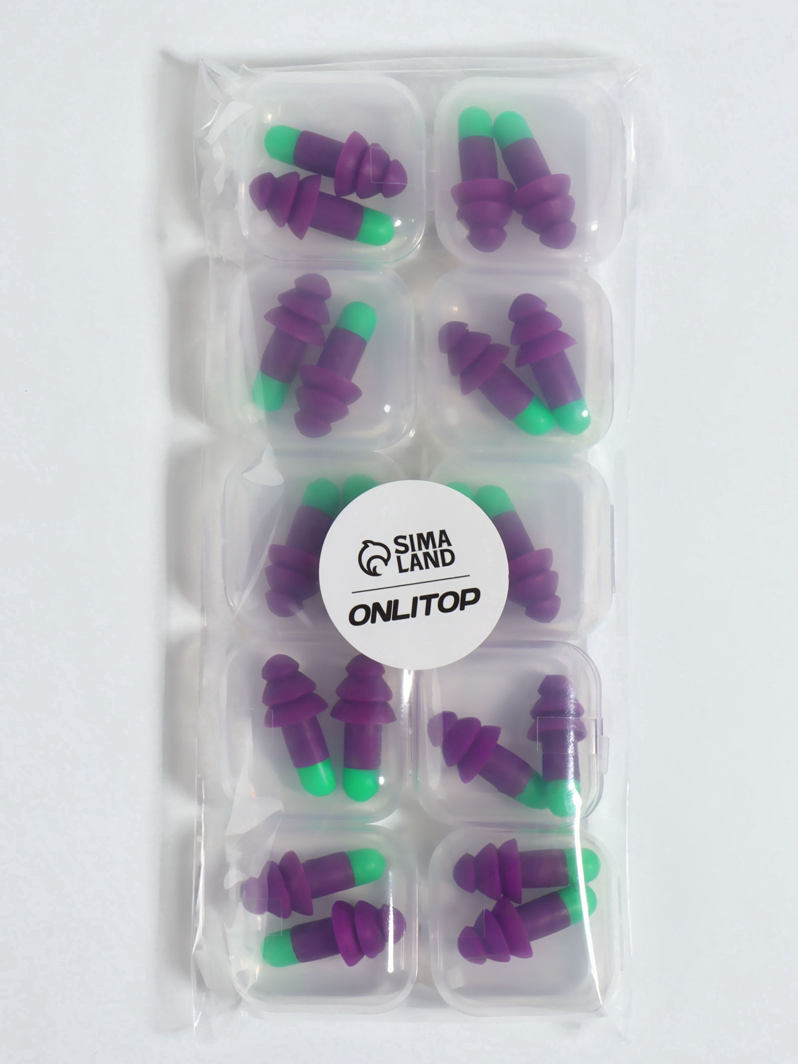 Беруши, 3x1.3 см, в футляре, фасовка 10 шт., силиконовые, фиолетовый/зелёный, 3.5x3.5x2 см., ONLITOP, Китай