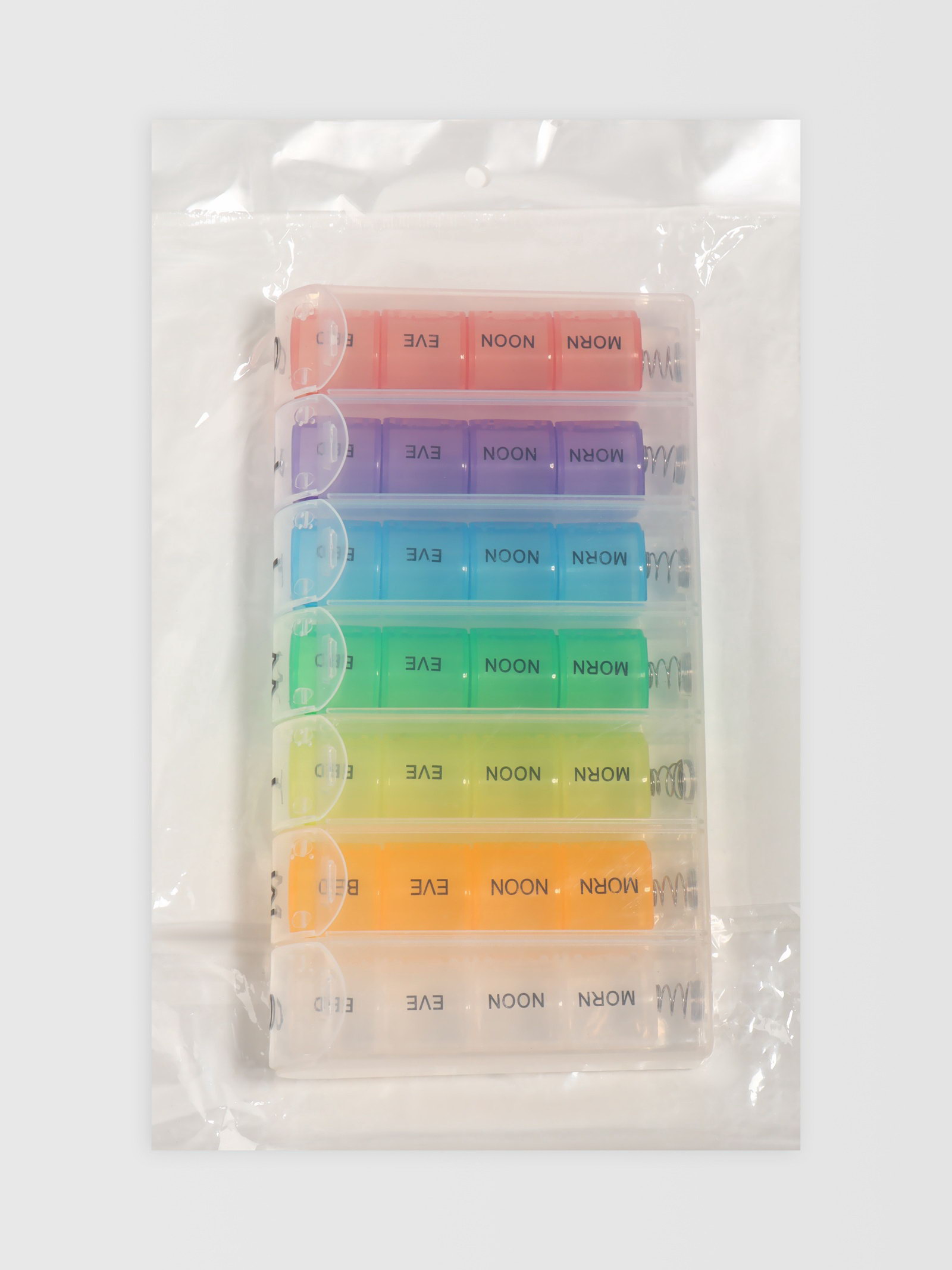 Таблетница - органайзер "Неделька", английские буквы, утро/день/вечер/ночь, 10x20x3 см, 7 контейнеров по 4 секции, разноцветная, 20x10x3 см., ONLITOP, Китай