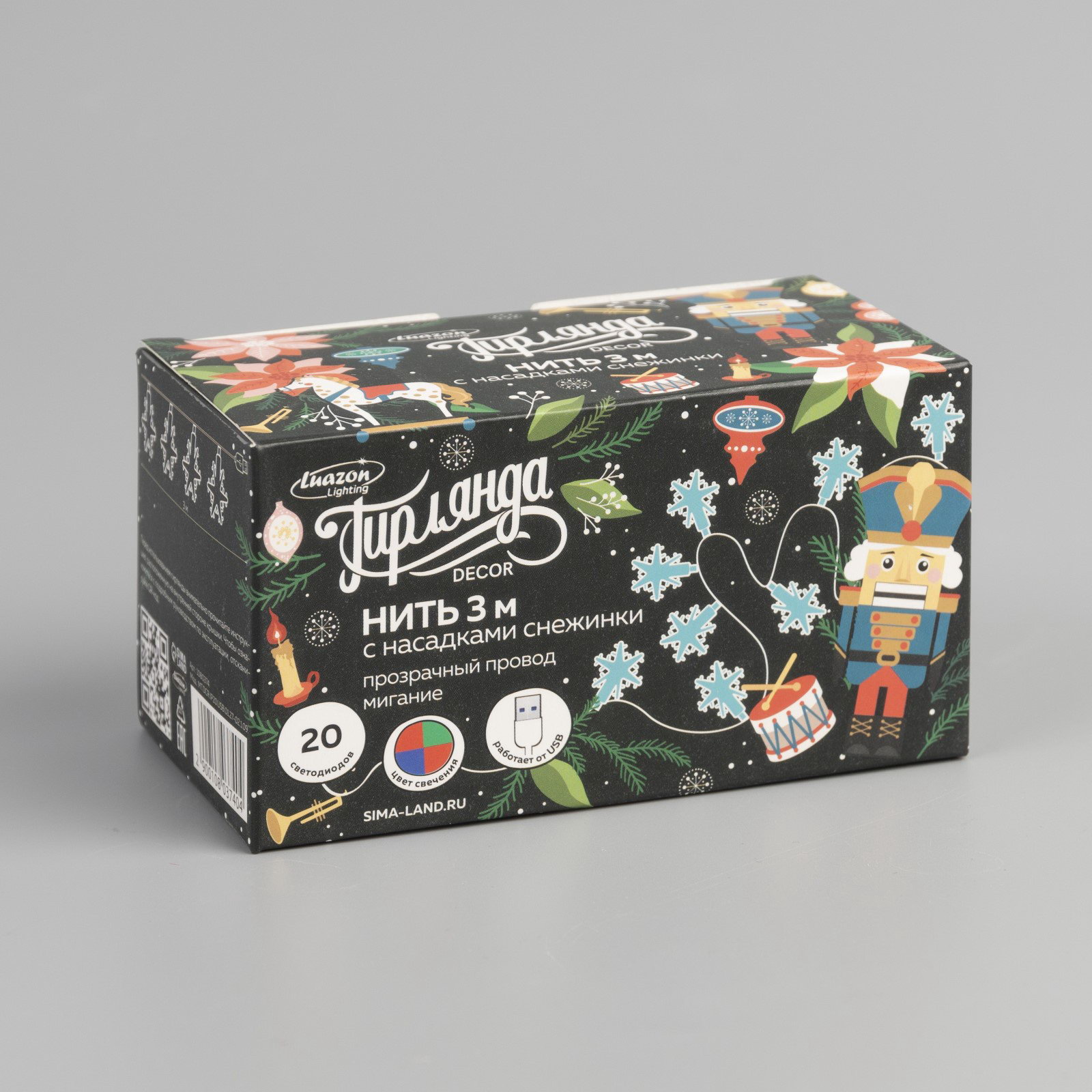 Гирлянда "Нить" 3 м с насадками "Снежинки малые", IP20, прозрачная нить, 20 LED, свечение мульти, Luazon Lighting, Китай
