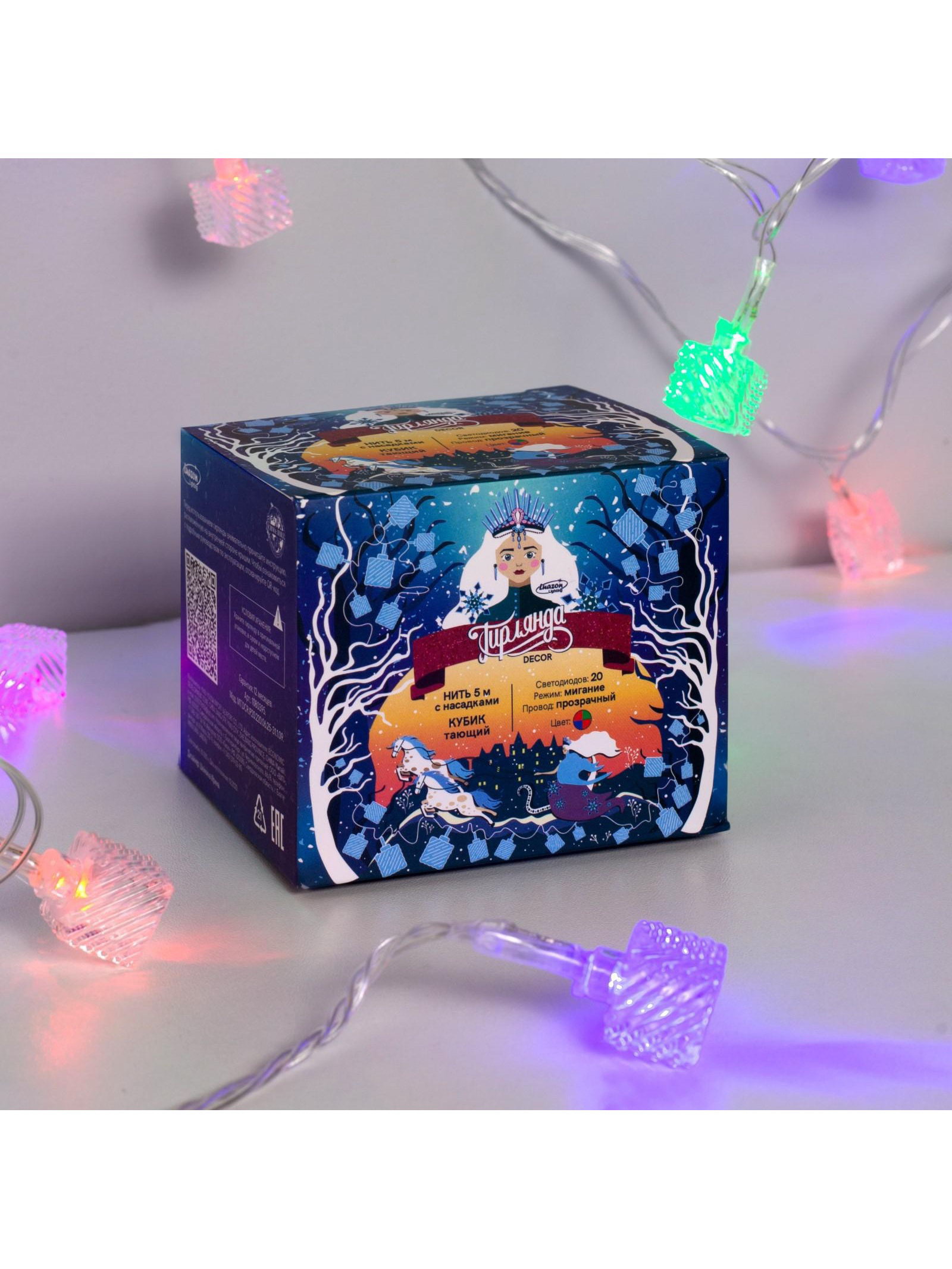 Размер упаковки: 7.5 x 7 x 8.5 см. Цвет нити гирлянды: Прозрачный Длина, м: 5 Применение: Внутреннее Вид лампы: Светодиодная Насадки: Да Вид гирлянды: Гирлянда-нить Количество режимов: 1 Режим работы: Мигание Наличие блока питания: Нет Тип подключения: Шнур питания Материал насадок: Пластик tnved: 9405310000 Гарантийный срок, мес.: 12 Количество ламп: 20 Материал нити: ПВХ Необходимая комплектация: Не нужна Размер насадки, мм: 21 x 16 Вид насадки: Кубики Цвет свечения: RG/RB Степень защиты: IP20 Тематика праздника: Новый год Температурный режим: От -10 до +35 ℃ Тип питания: От сети 220 В