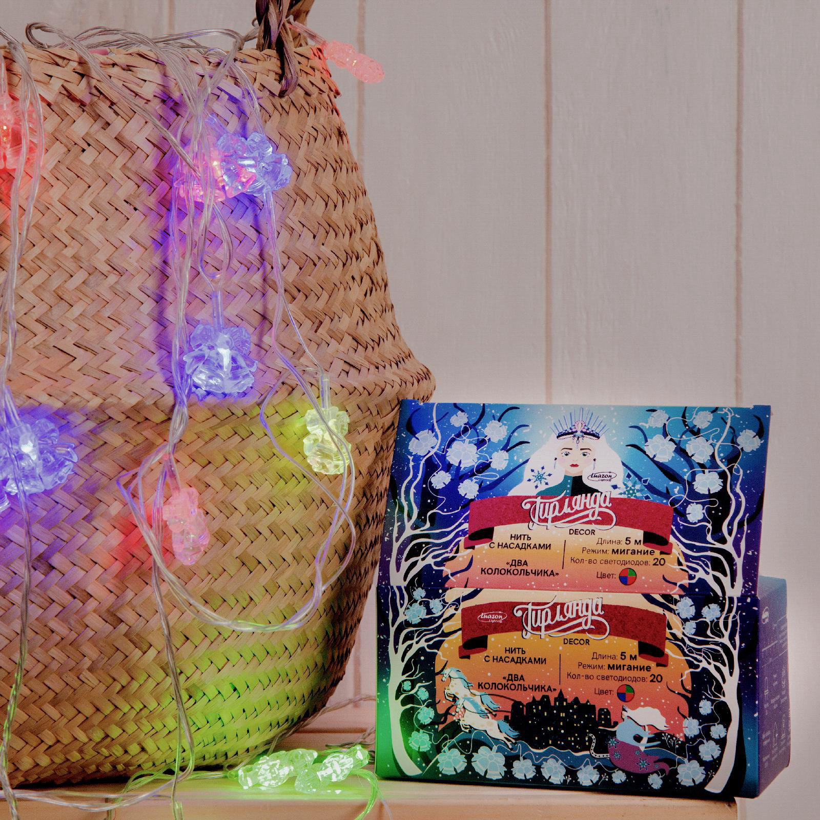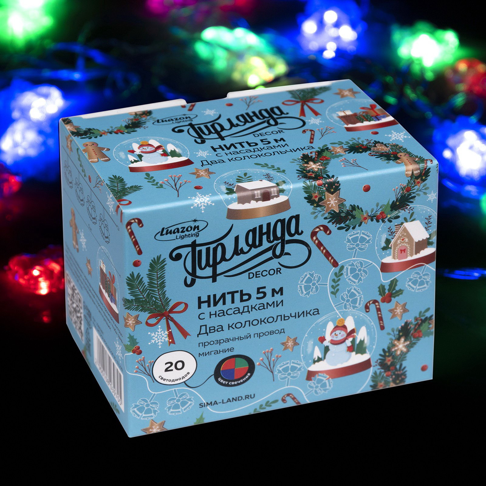 Гирлянда "Нить" 5 м с насадками "Два колокольчика", IP20, прозрачная нить, 20 LED, свечение мульти, Luazon Lighting, Китай