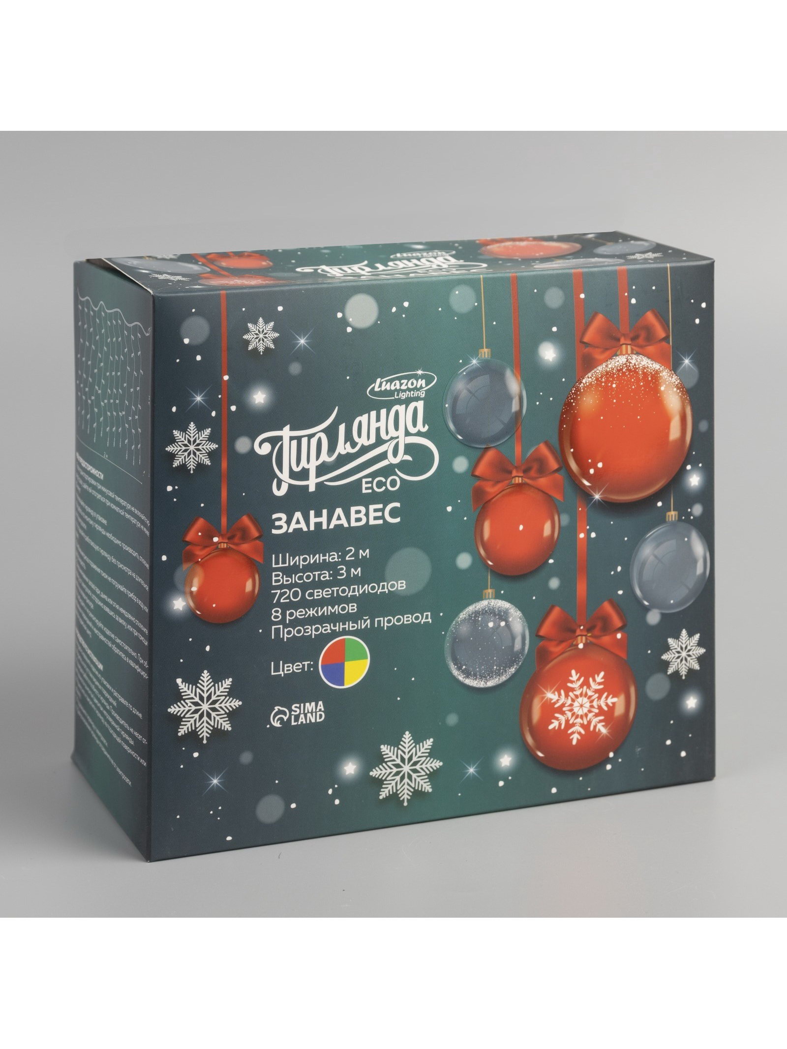 Гирлянда "Занавес" 2x3 м, IP20, прозрачная нить, 720 LED, свечение мульти, 8 режимов, 220 В, Luazon Lighting, Китай