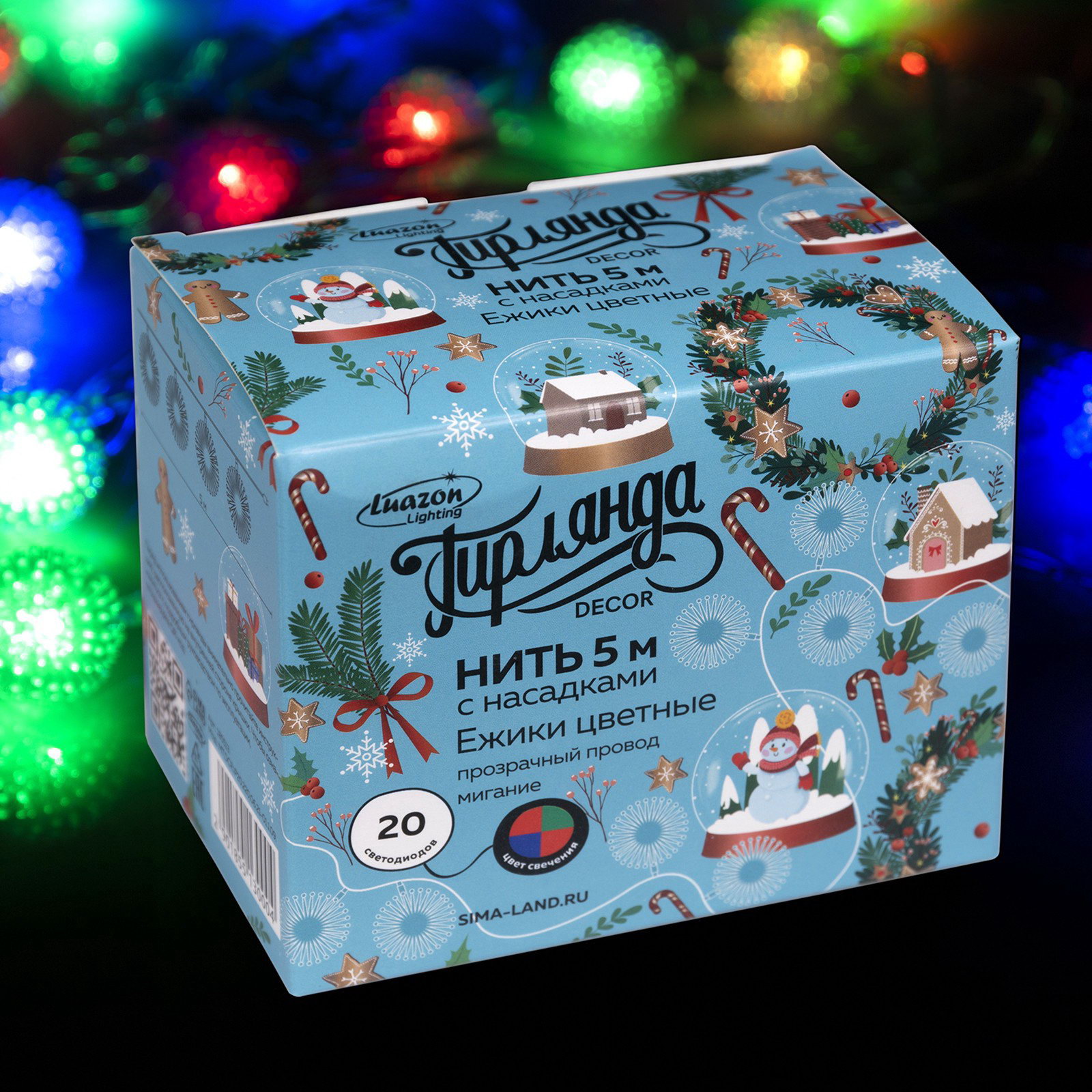 Гирлянда "Нить" 5 м с насадками "Ёжики цветные", IP20, прозрачная нить, 20 LED, свечение мульти, Luazon Lighting, Китай