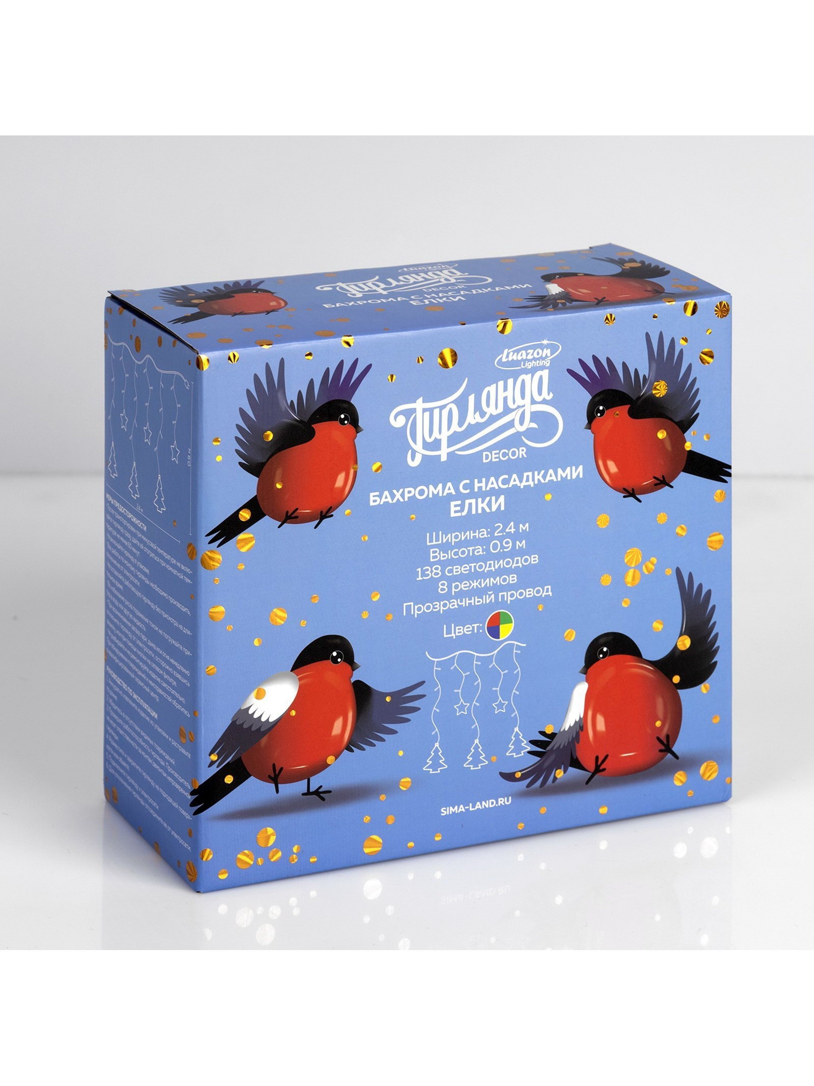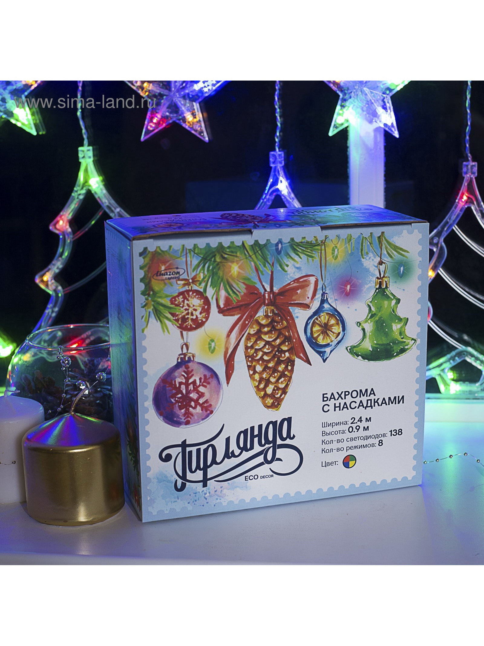 Размер упаковки: 10 x 20 x 21.5 см. Применение: Внутреннее Вид гирлянды: Бахрома Размер, м: 2.4 x 0.9 Вид лампы: Светодиодная Цвет свечения: Мульти Режим работы: Задаётся контроллером Наличие блока питания: Нет Насадки: Да Цвет нити гирлянды: Прозрачный Тип подключения: С контроллером Количество режимов: 8 Материал насадок: Пластик Материал насадок: Пластик tnved: 9405310000 Гарантийный срок, мес.: 12 Количество ламп: 138 Материал нити: ПВХ Необходимая комплектация: Не нужна Вид насадки: Ёлочки Ширина, м: 2.4 Высота, м: 0.9 Степень защиты: IP20 Тематика праздника: Новый год Температурный режим: От -10 до +35 ℃ Тип питания: От сети 220 В