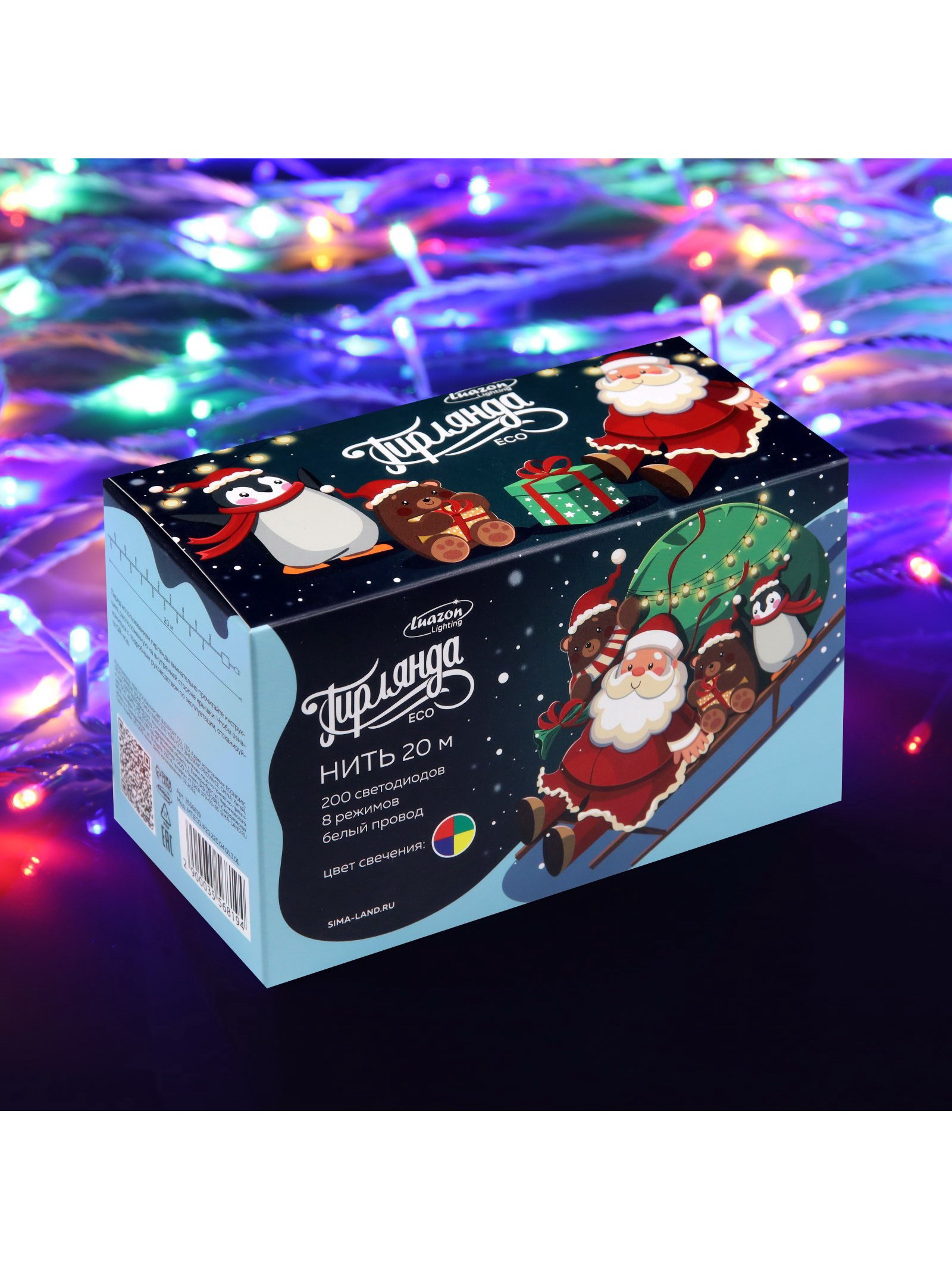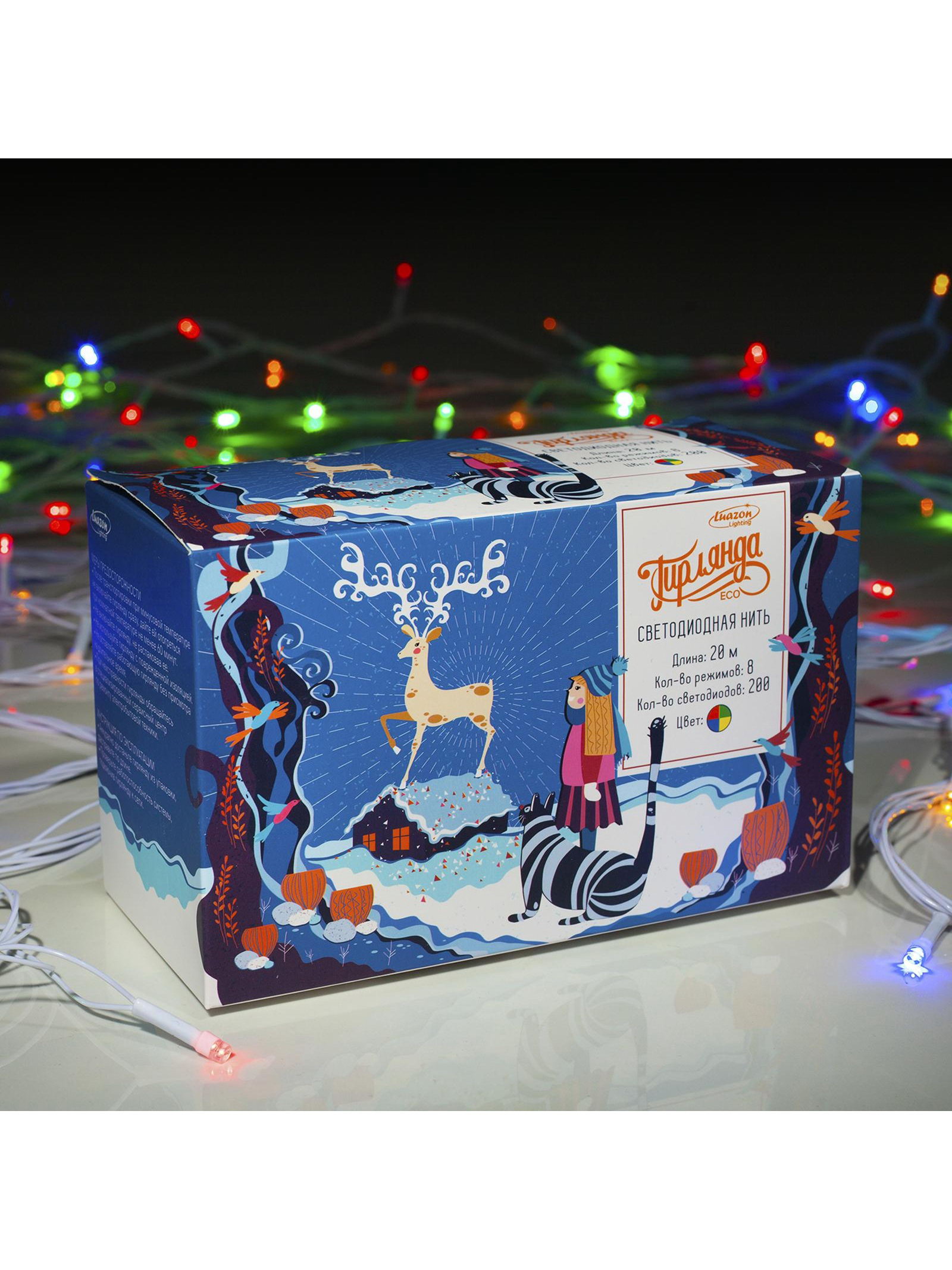 Гирлянда "Нить" 20 м, IP20, белая нить, 200 LED, свечение мульти, 8 режимов, 220 В, 8x15x9 см., Luazon Lighting, Китай