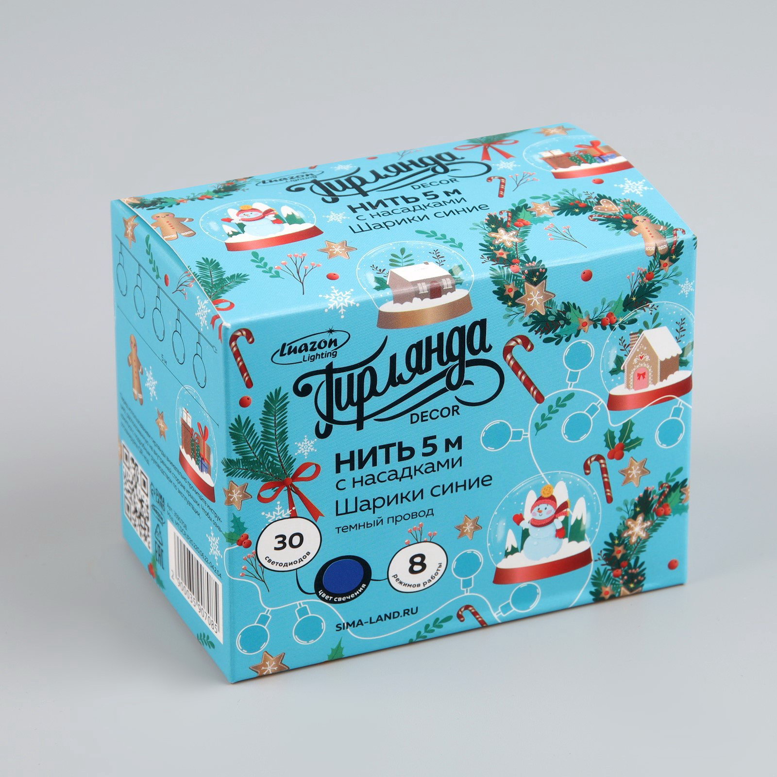 Гирлянда "Нить" 5 м с насадками "Шарики синие", IP20, тёмная нить, 30 LED, свечение синее, 8 режимов, 220 В, Luazon Lighting, Китай