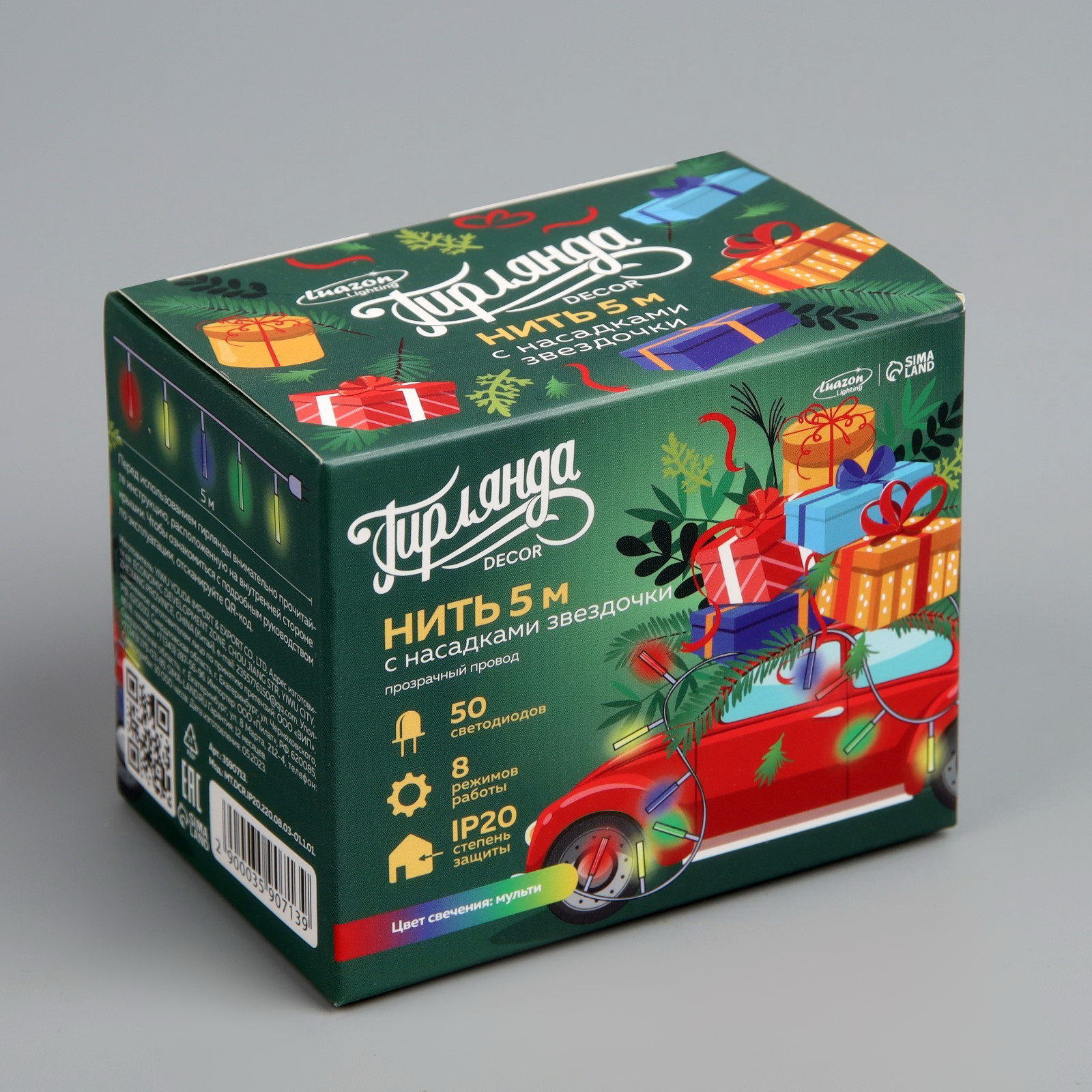 Гирлянда "Нить" 5 м с насадками "Звёздочки", IP20, прозрачная нить, 50 LED, свечение мульти, 8 режимов, 220 В, Luazon Lighting, Китай