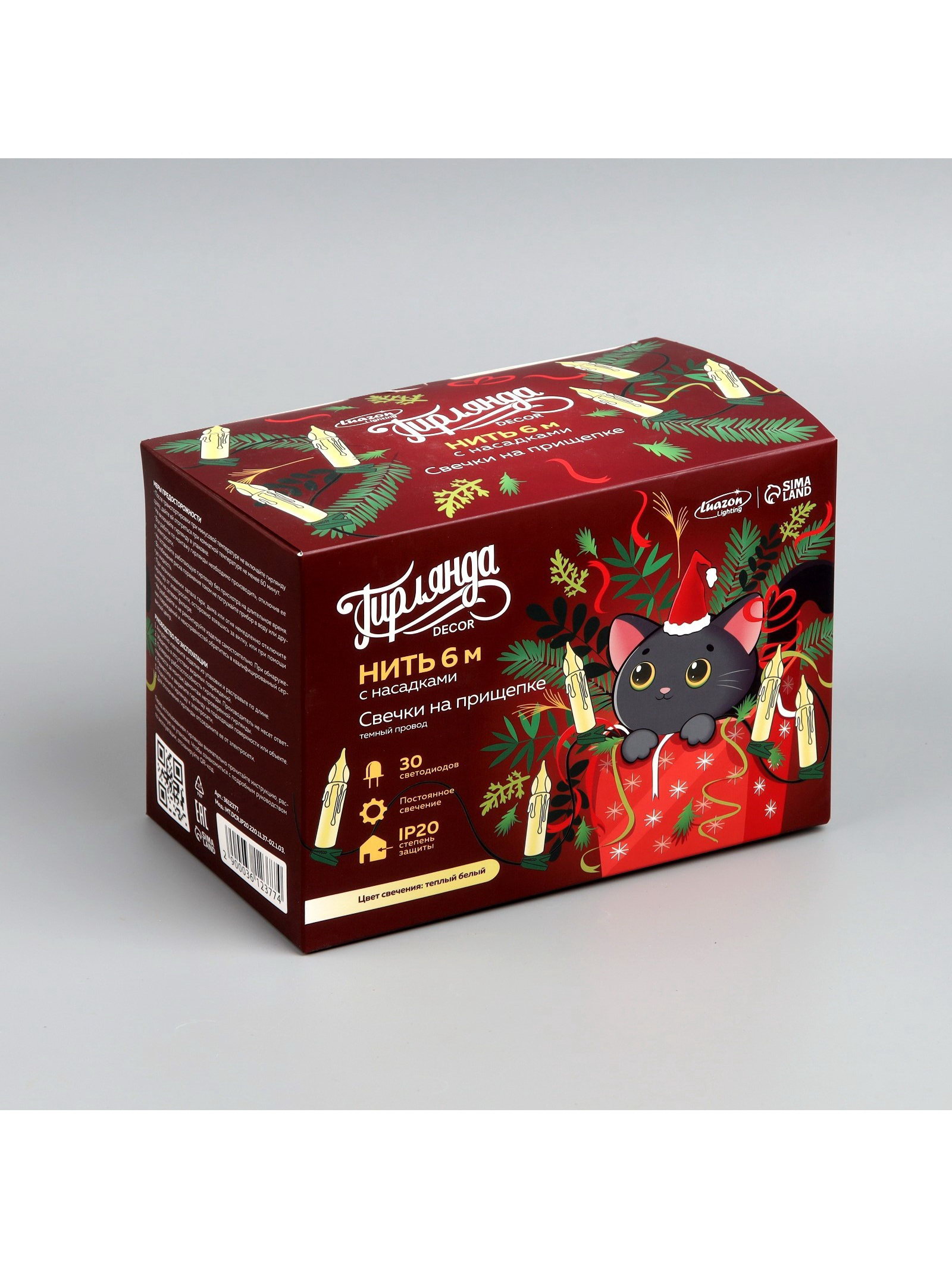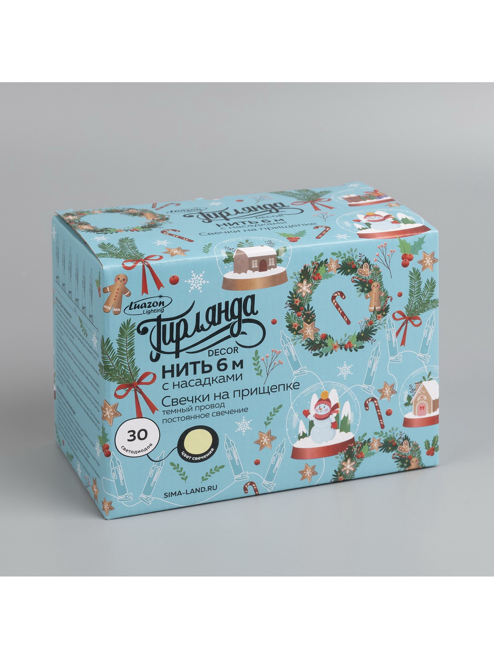 Гирлянда "Нить" 6 м с насадками "Свечи на прищепке", IP20, тёмная нить, 30 LED, свечение тёплое белое, 220 В, 13x18.5x11 см., Luazon Lighting, Китай