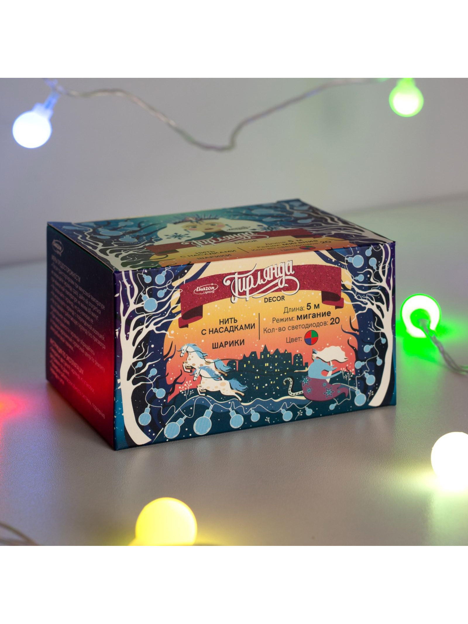 Размер упаковки: 6 x 7 x 8.5 см. Длина, м: 5 Применение: Внутреннее Вид лампы: Светодиодная Насадки: Да Цвет нити гирлянды: Прозрачный Вид гирлянды: Гирлянда-нить Режим работы: Мигание Тип подключения: Шнур питания Количество режимов: 1 Наличие блока питания: Нет Материал насадок: Пластик Гарантийный срок, мес.: 12 tnved: 9405310000 Количество ламп: 20 Материал нити: ПВХ Необходимая комплектация: Не нужна Размер насадки, мм: 22 x 16 Вид насадки: Шарики Цвет свечения: RG/RB Степень защиты: IP20 Тематика праздника: Новый год Температурный режим: От -10 до +35 ℃ Тип питания: От сети 220 В
